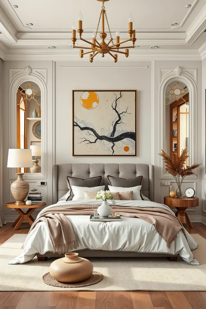 The design element that I prefer the most to create such rooms is through choosing a single artwork piece as the centerpiece- most of the time, it can be an abstract canvas or a peaceful landscape. I combine it with sculptural bedside lamps or dresser ceramics in a geometric shape. These artistic features control the mood and still bring out elegance.