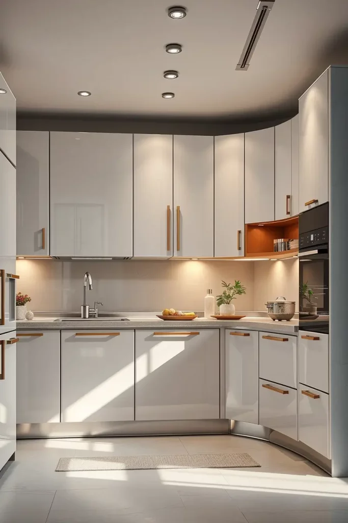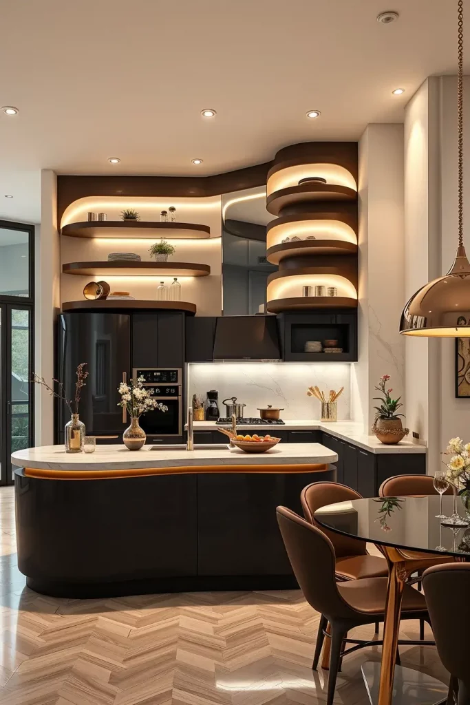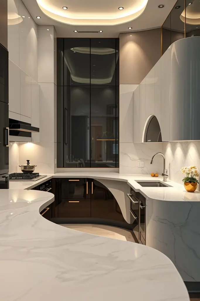 I tend to put lighting on the edges of the curved countertops or inside an enclosed glass shelf to provide depth and ambiance. These minor details contribute to the sleek atmosphere of the area and make the process of cooking both convenient and fun.