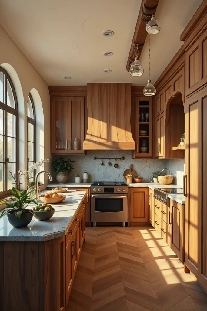 I pay attention to flow forms, natural lighting and touchable materials when designing organic kitchens. There is harmony and balance between curved furniture, wooden textures and stone surfaces. The geometry of the room is softened with the help of rounded windows, arched niches, and smooth cabinetry, which supports the organic mood.