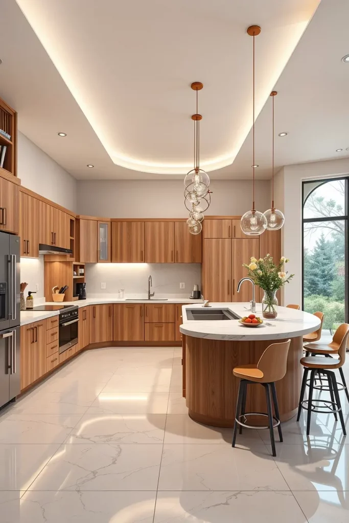 In this part, I would include sculptural lighting elements over the curved island in order to accentuate the architectural beauty.