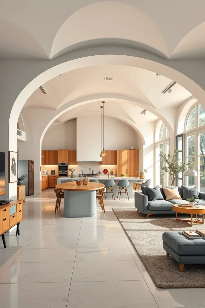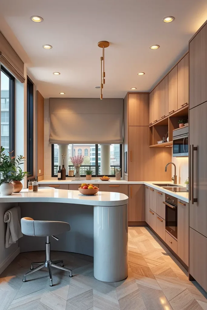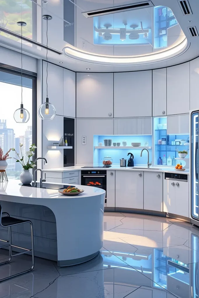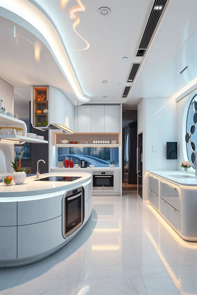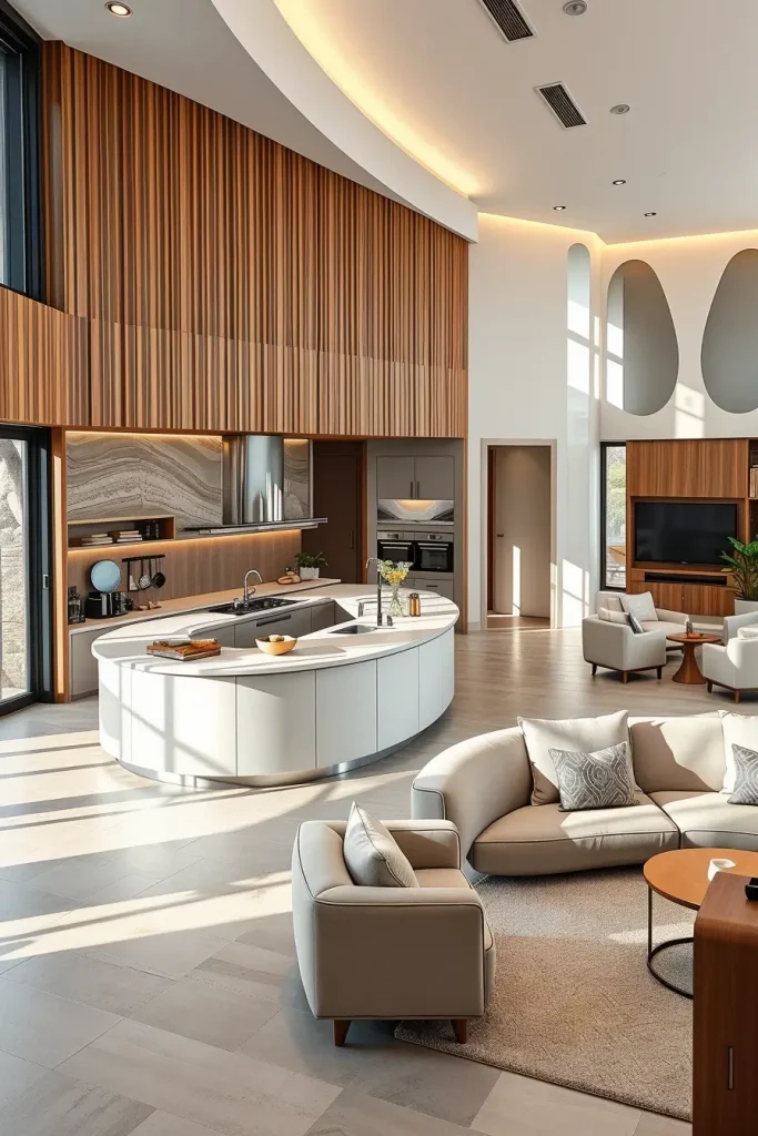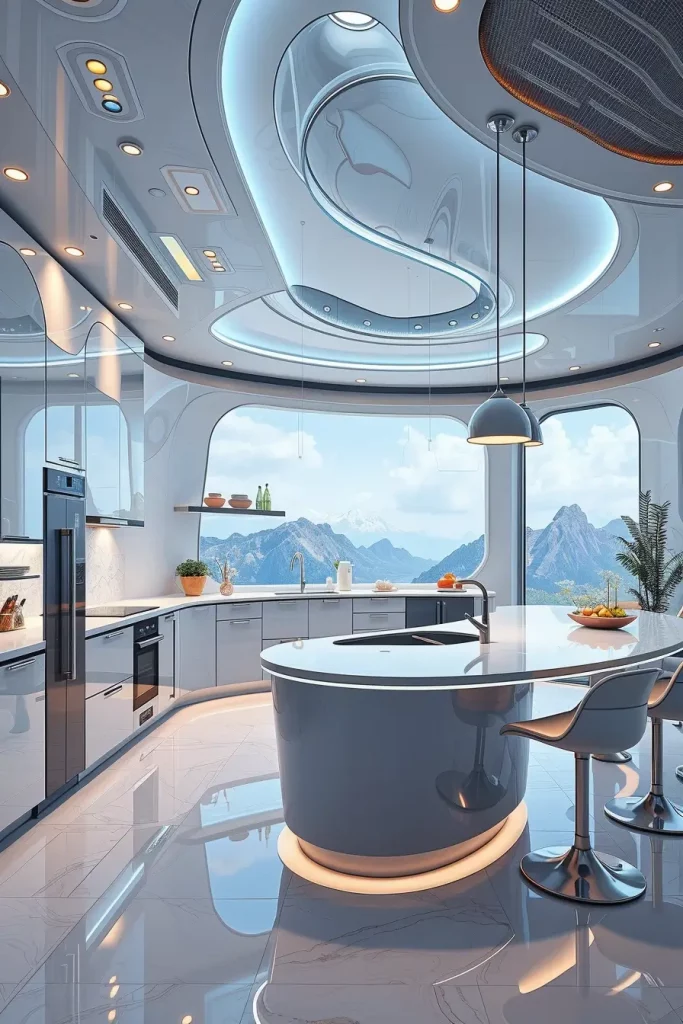 Every feature of this design is functional. I would like to use rounded tops with hidden induction cooktops and wall-based modular storage with recessed handles to form a seamless appearance. Smooth smart appliances become part of the cabinetry and are well combined to create a unified look. Sleek furniture including curved stools and rounded contours on the furniture supplements the appearance.