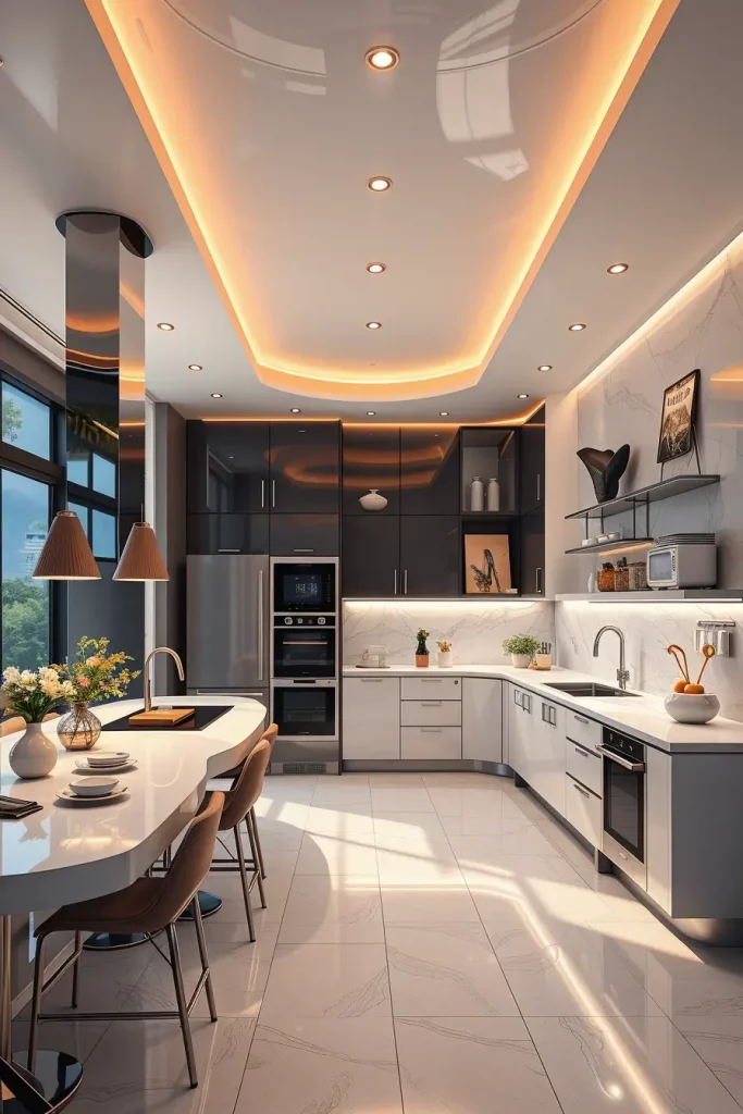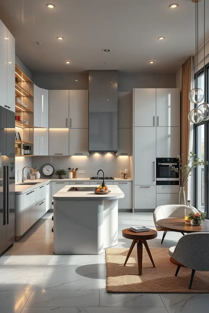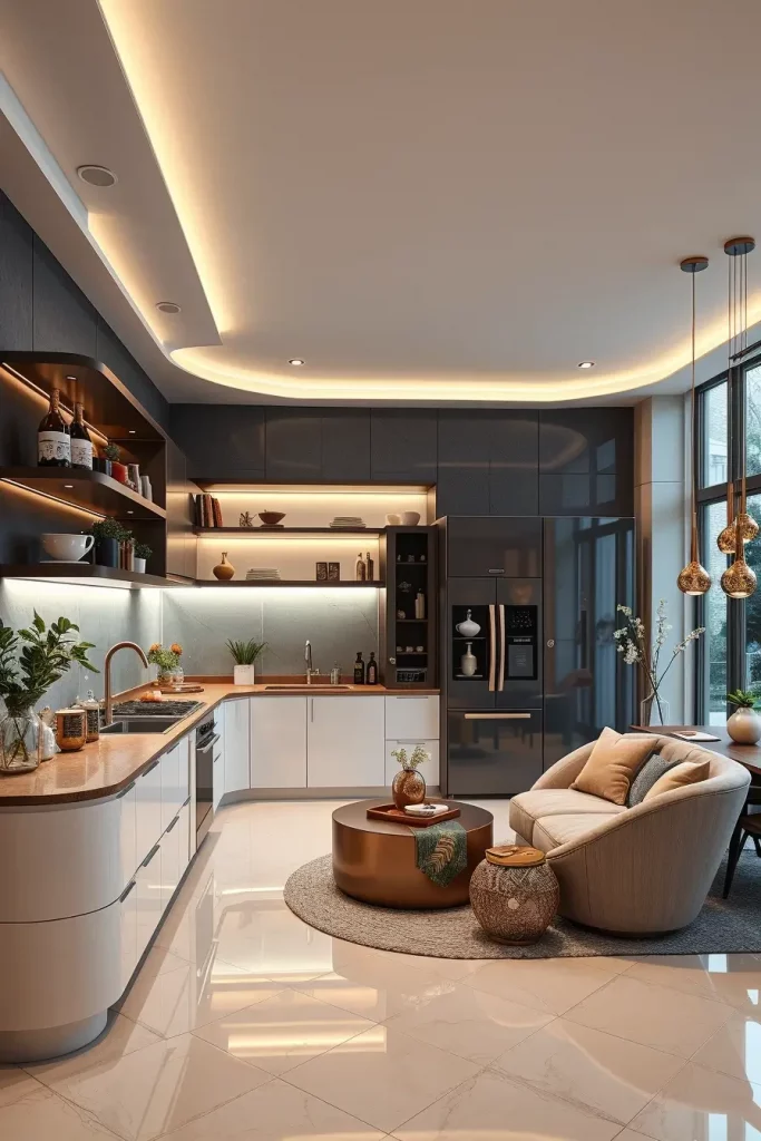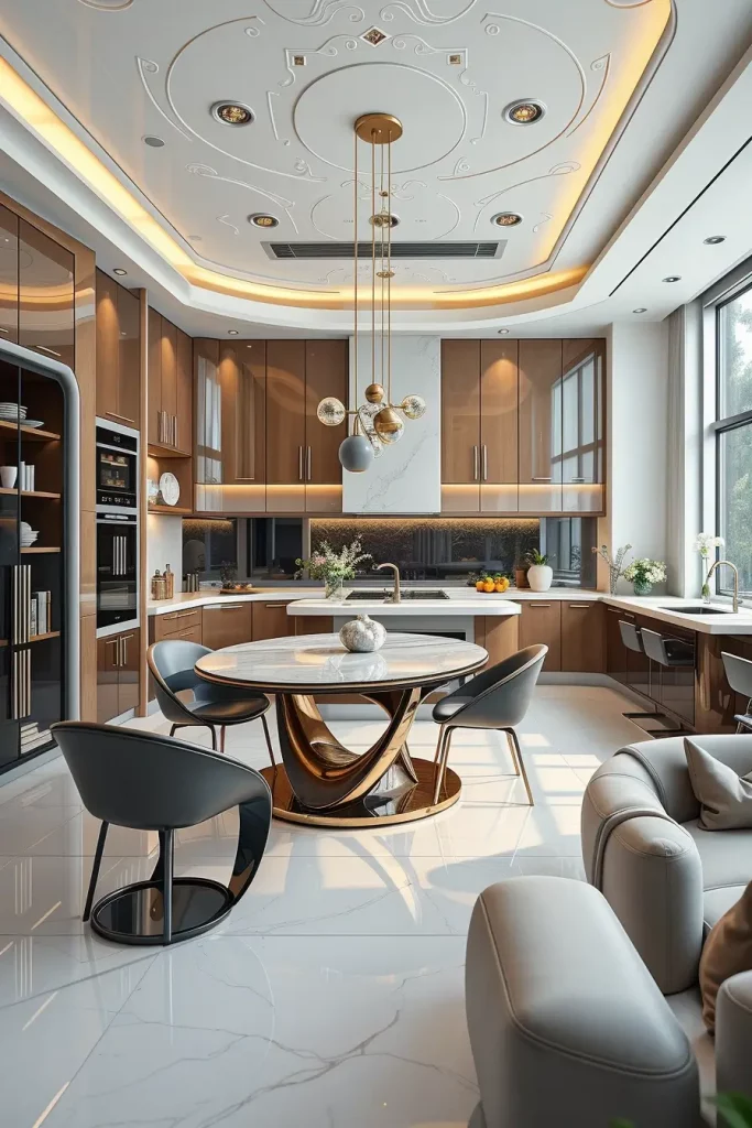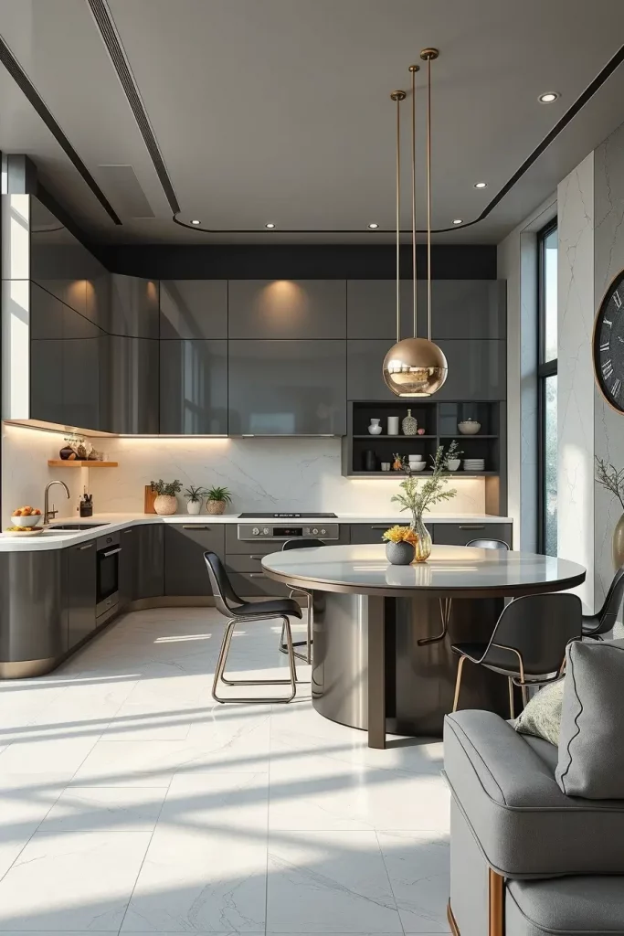 I prefer built-in shelving, concealed storage, and portable islands that may be configured in various shapes in accordance with the event. The effect of using designer materials, including brushed metal, quartz, and high-gloss lacquer, is a high-tech, classy image. The appearance is unified with curved benches, oval dining tables, and ergonomic stools that are streamlined.