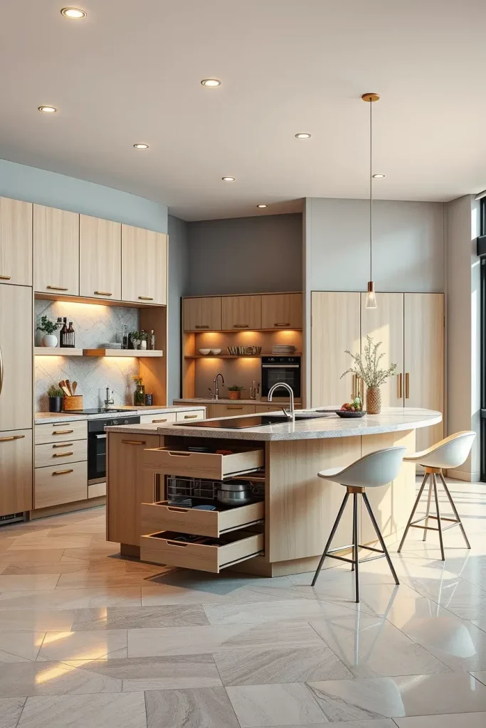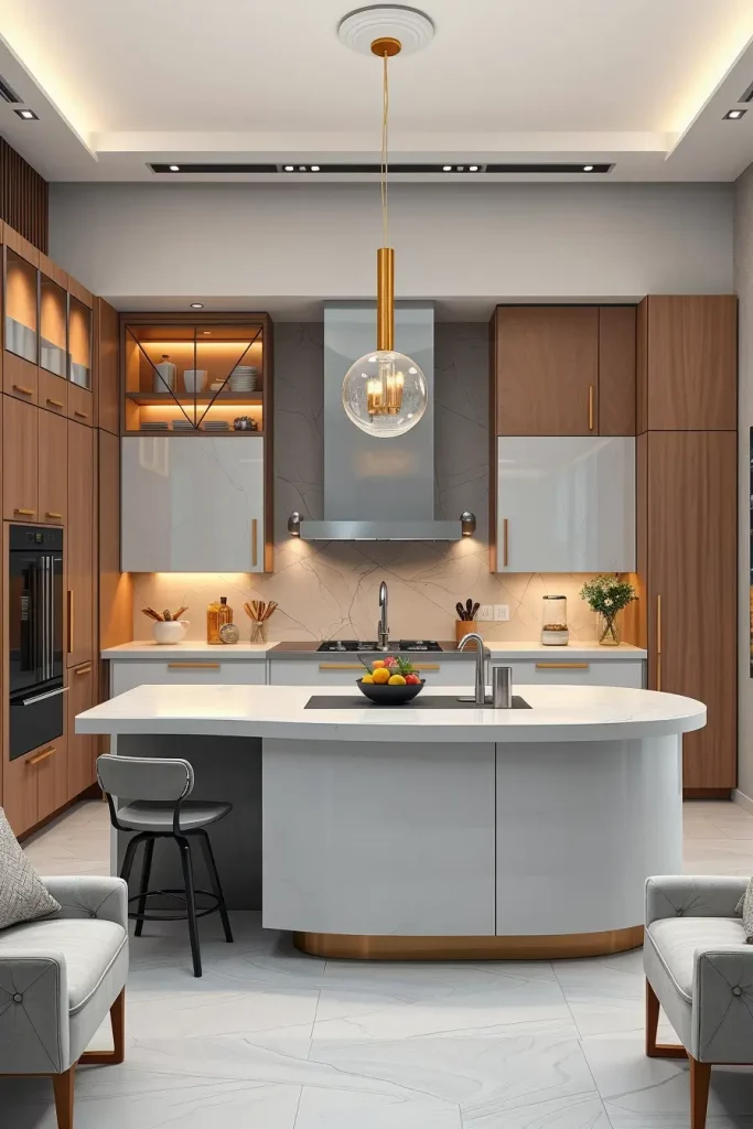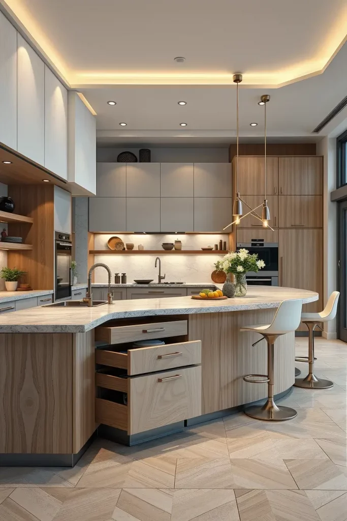 I integrate curved kitchen countertops, tiered kitchen islands and smooth cabinetry in my work to create a flowing and comfortable impression. The top floor could be a dining table with smooth bar stools, whereas the bottom part would be incorporated with intelligent drawers and in-built appliances. I would use such materials as white oak vinyl, matte stone, and textured surfaces to feel something and touch something elegant.