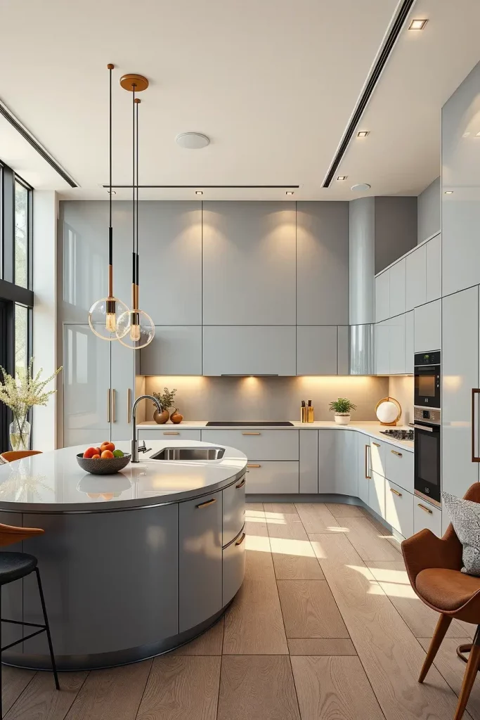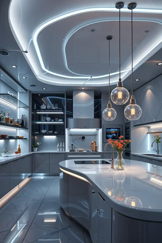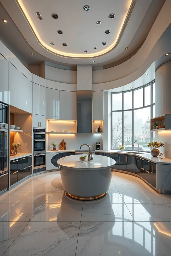 The next trend in futuristic designs is soft-edged kitchen islands. I consider those shapes not only convenient but also poetic, they introduce visual warmth and enhance the circulation and safety in crowded kitchen areas. The curvy lines promote an organic work process, which would be otherwise sterile with the traditional layouts.