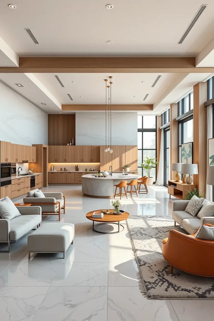 The idea of the flow of the kitchen and living room is a trendy idea of modern design that I consider encouraging. Layout 2026 Kitchen layouts adopt open plans where the spaces are defined with the help of a curved or oval separation while staying connected.