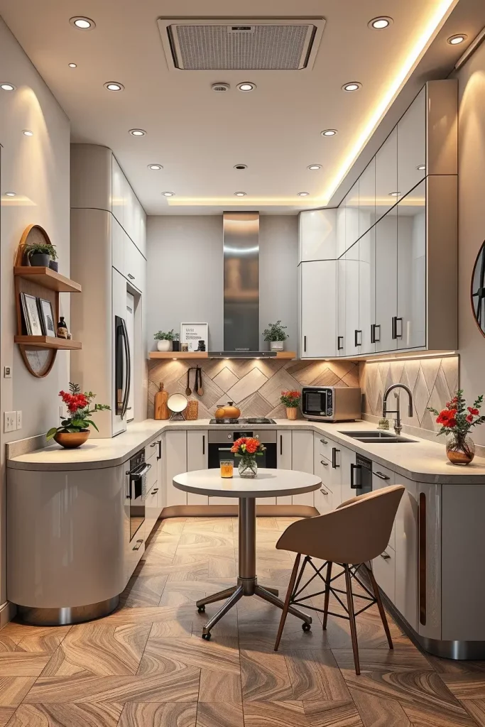 In designing small kitchens, I resort to retractable counter, sliding doors, and built-in seating. Easy navigation with rounded corners makes the view more relaxed and beautiful. The neutral sounds, metallic accents, and in-built light helps to make the room larger.