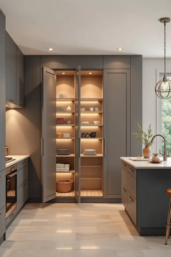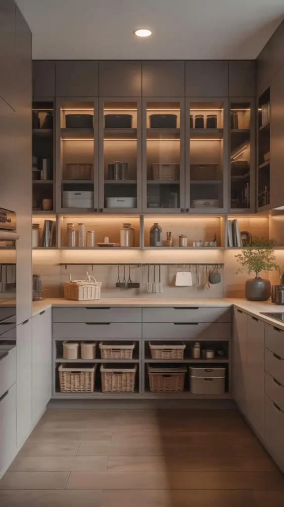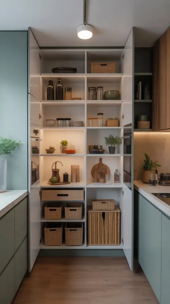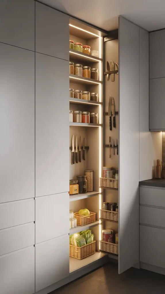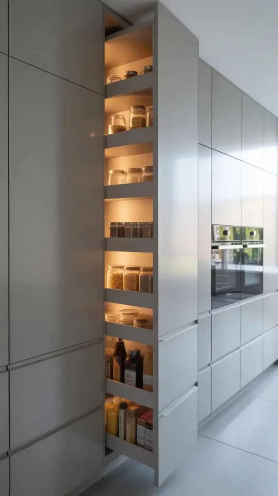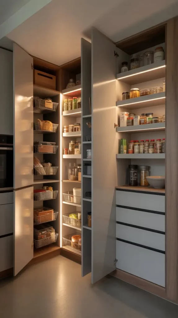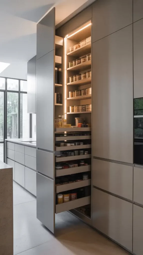 In tight spaces, an inbuilt pantry will help. It can be fitted perfectly well in kitchen cabinetry to provide a smooth and continuous appearance. I consider the given concept to be especially helpful in open-concept houses where visual flow plays a central role.