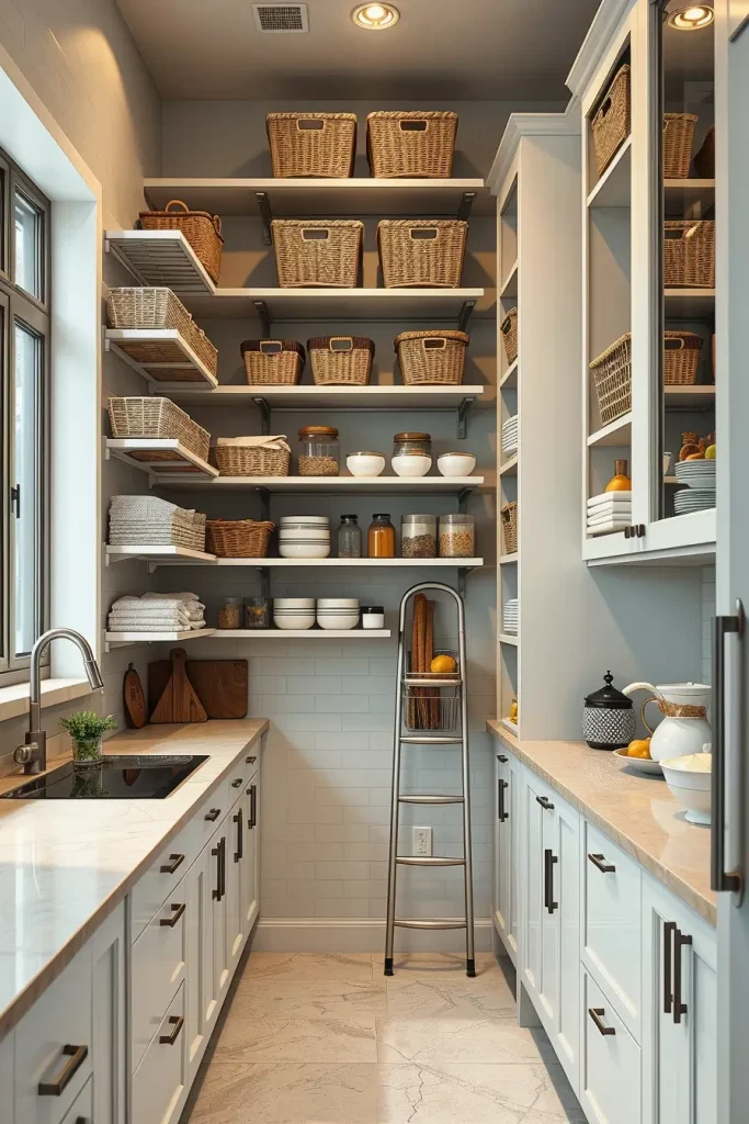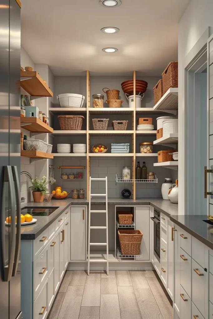 I suggest use of small shelves, stacked baskets and magnetic shelves on jars and spices. The small foldable ladders also help in accessing the higher shelves. The color scheme must be kept light (soft whites and grays) to make the pantry look bigger.