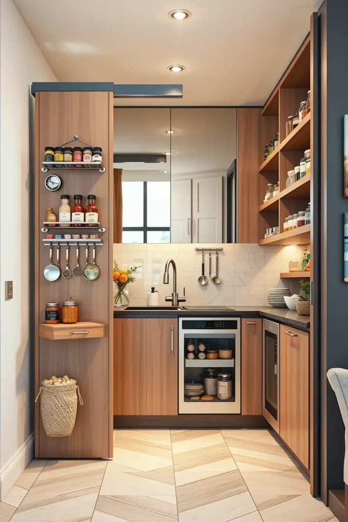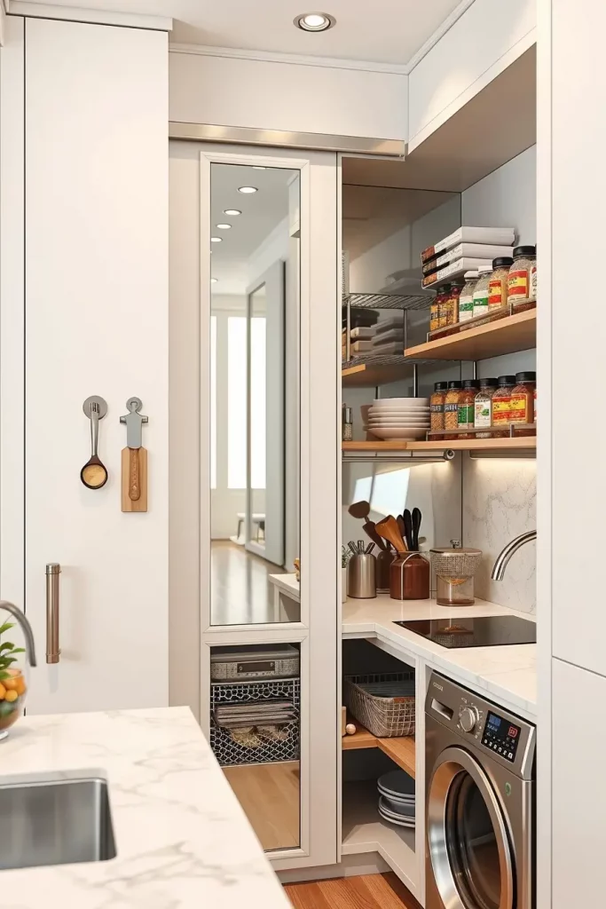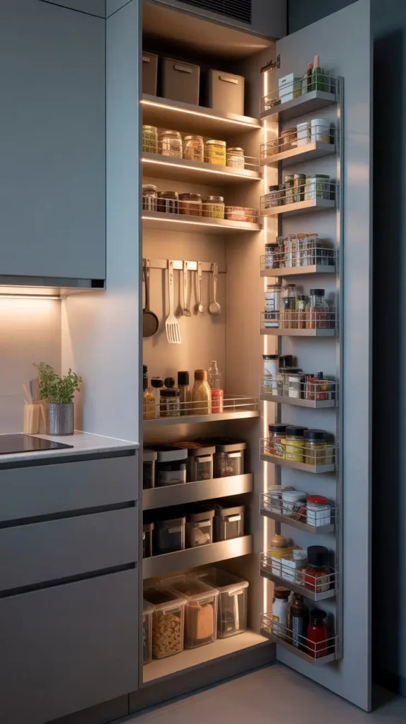 Pantries that are hidden can also be used in small apartments, and in my case, they help to save every inch. According to Architectural Digest, secret storage enhances movements in a kitchen and ensures no countertops are cluttered. To narrow this concept further, I would like to propose the integration of the light system that switches on when the doors are opened to make it more convenient.