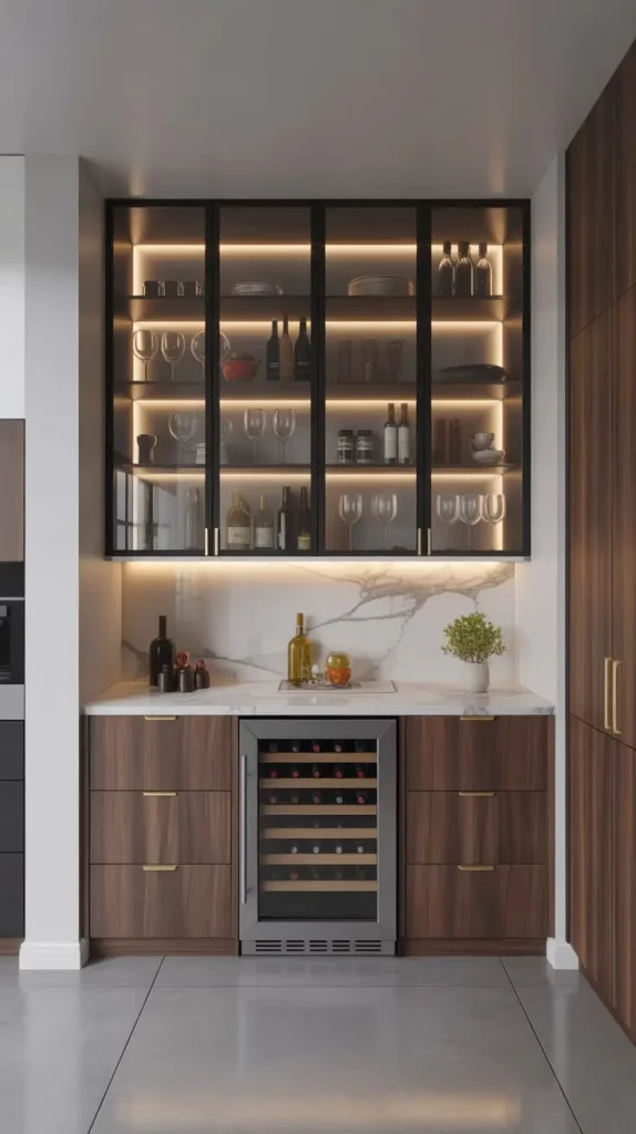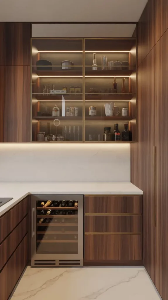 In this design, I am fond of using marble countertops, inbuilt glass display cabinets and touch-drawers. Convenience is usually shown by the introduction of hidden appliances like wine coolers or mini fridges. I also put brushed brass hardware and LED-lit shelves in the pantry to provide a gentle light to the pantry, which underscores colors such as walnut wood and polished stone.