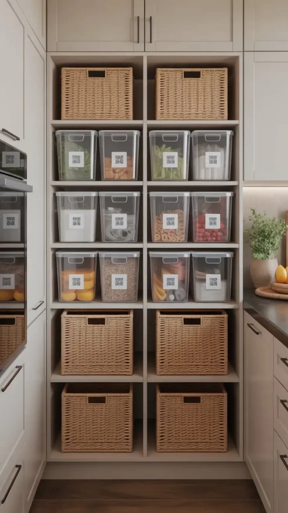 I combine transparent bins that are stackable and woven baskets in my designs. Clearly visible containers are a feature of transparent bins and textured containers bring in style. Pull-out rails and dividers ensure the availability of items and exclude overstocking. To further enhance it, I will occasionally add clever labels with QR codes that will match the grocery lists.