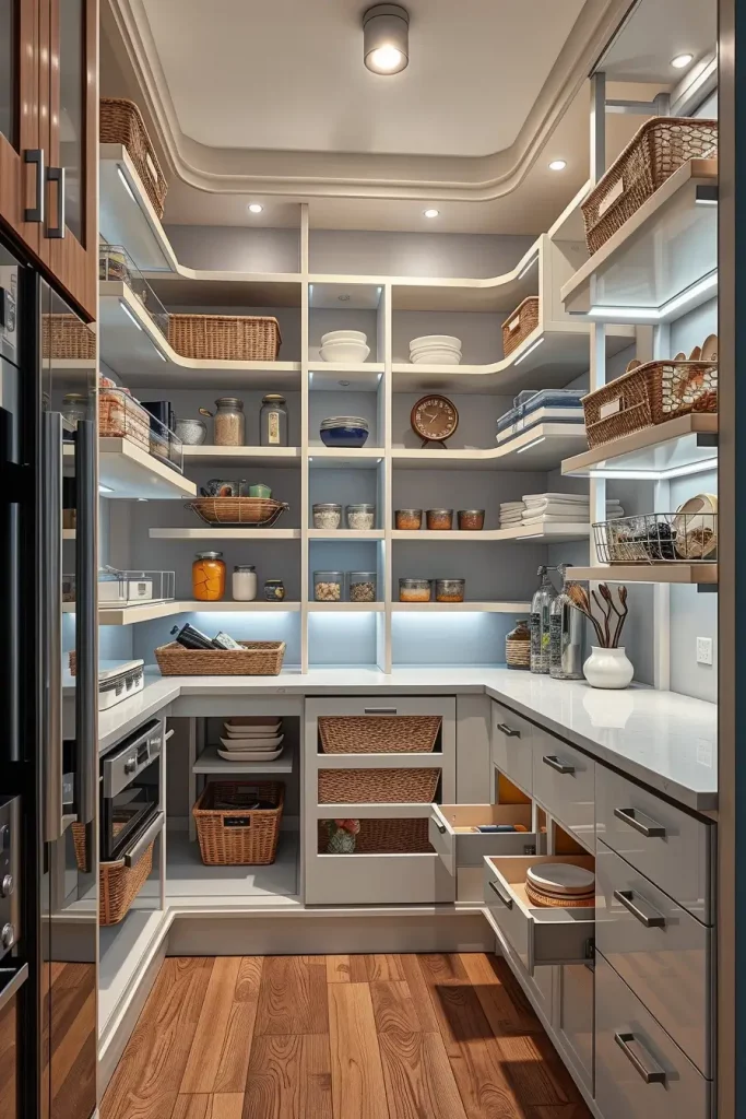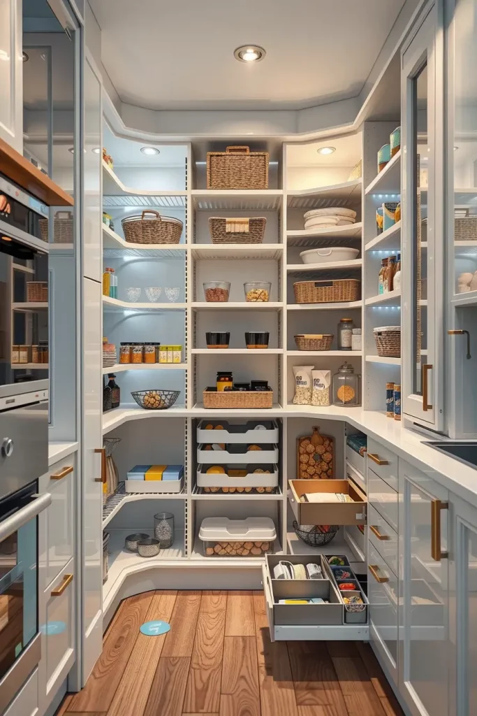 One of the most useful and stylish corner pantries in my professional opinion would be the best. Real Simple suggests that open shelves and drawers should be combined in order to maintain a balance between display and closed storage. To this idea, I would also include the pull-out trays of smaller appliances or snacks so that it would become even more efficient.