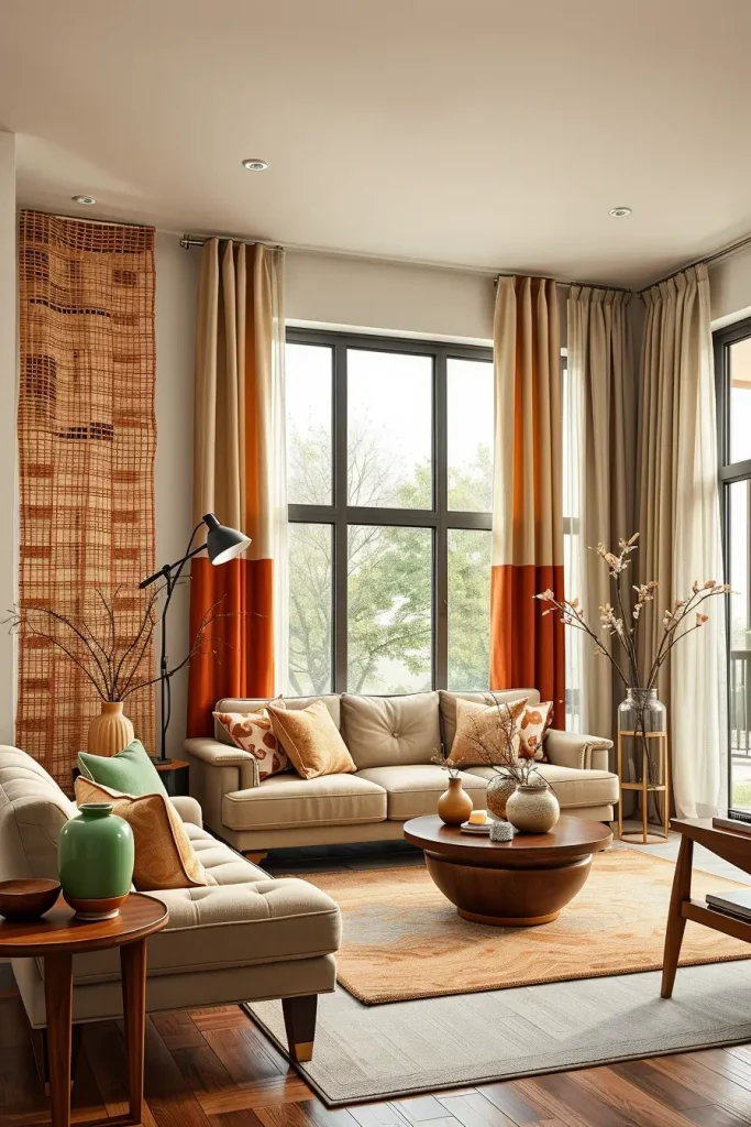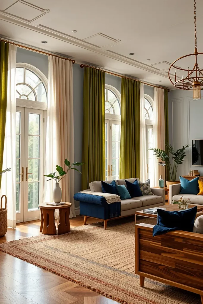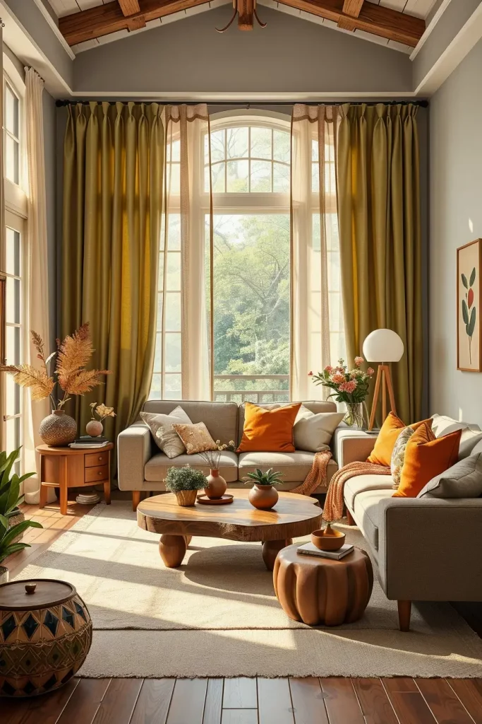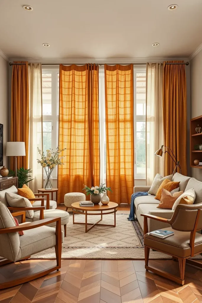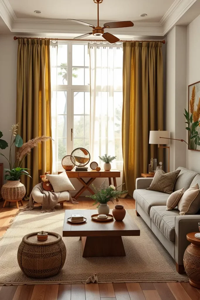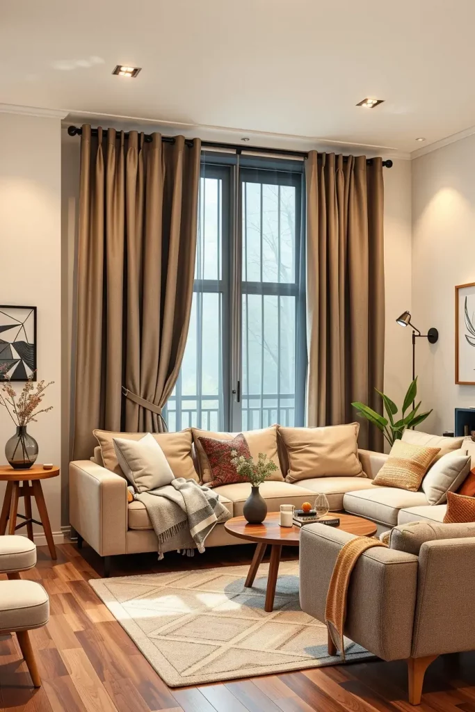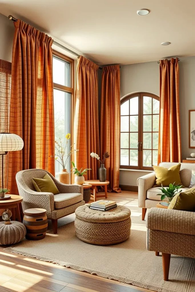 I prefer combining textured curtains with furniture of a similar feel, woven ottomans, boucle armchairs, or natural-wood side tables would be a good choice. Olive Green and Mustard Gold throw pillows also increase the look of the earthy palette besides providing the room with a unified appearance.