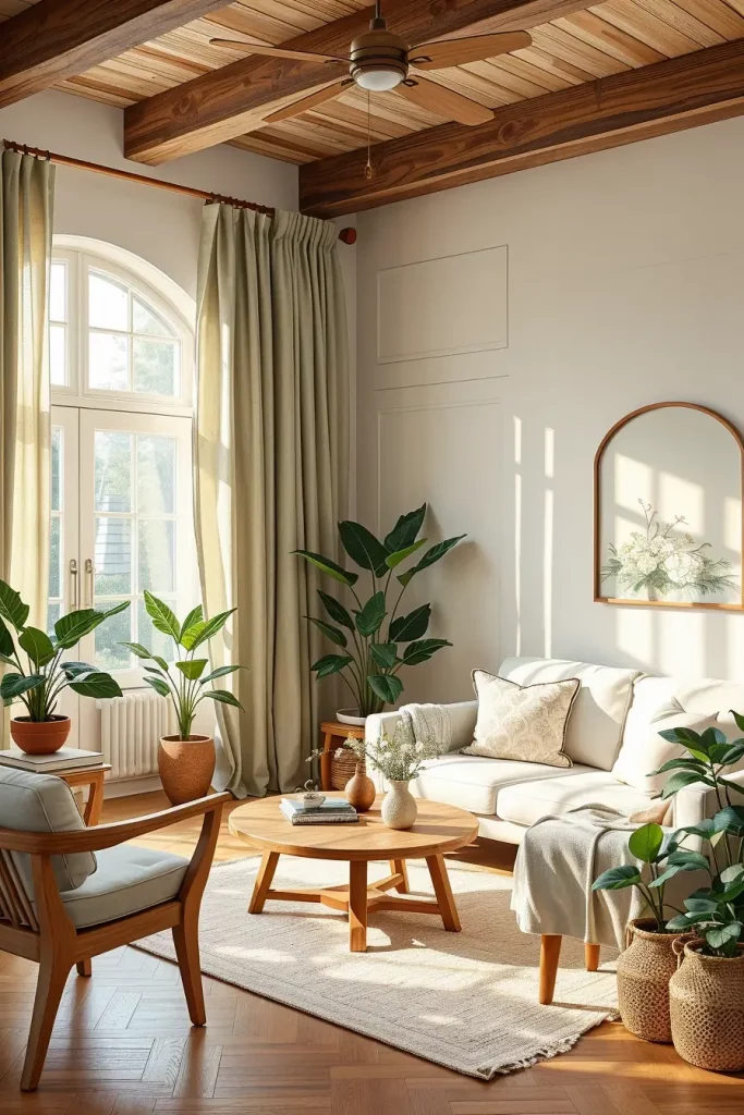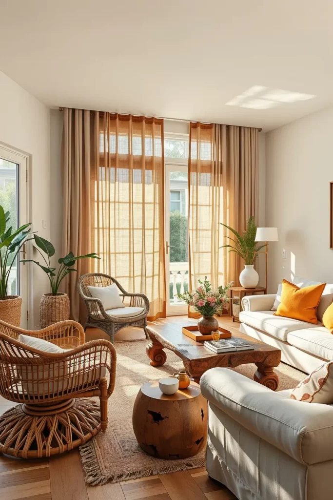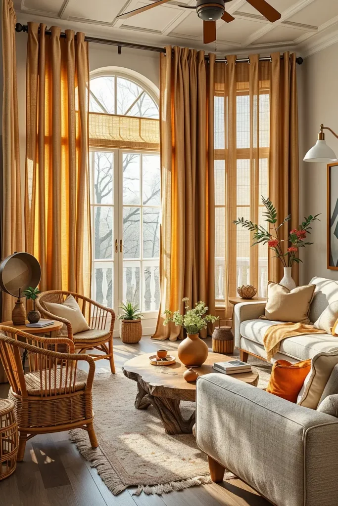 I believe that the combination of bamboo fiber curtains and organic furniture, including rattan chairs, reclaimed wood coffee tables, and linens on the upholster sofa makes a fashionable nature-associated appearance. The decorative accents are in Mustard Gold or Cinnamon Brown that give the whole palette warmer, and several considerations of Vanilla White make all colors seem brighter. Wood flooring is light-washed adding a natural feel to it.
