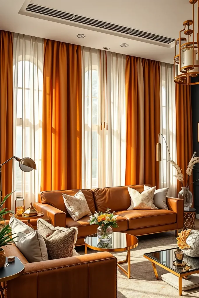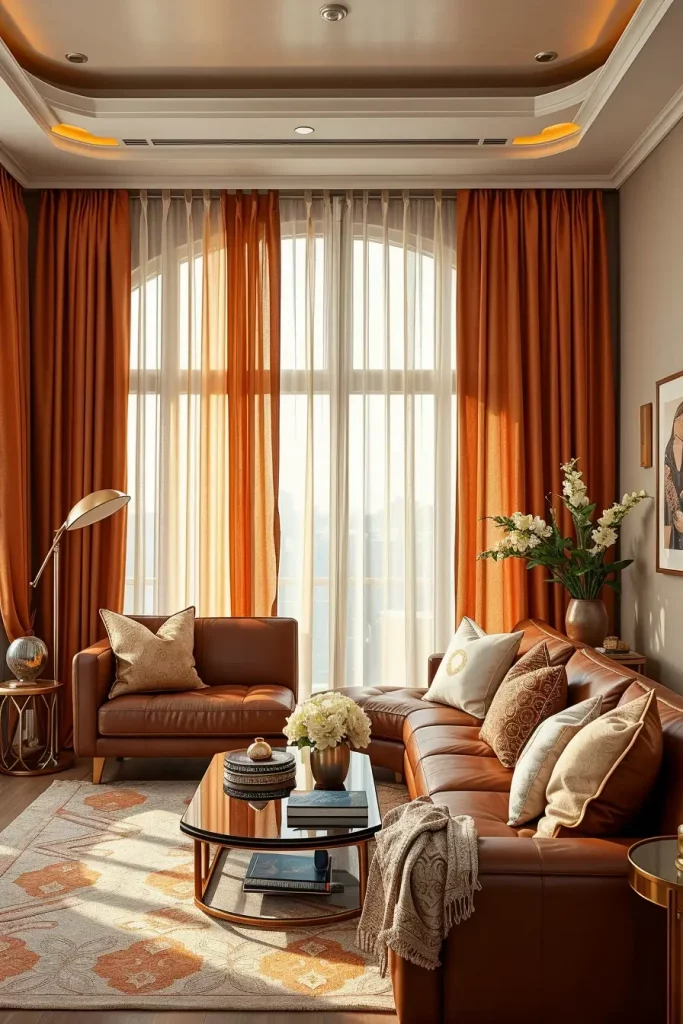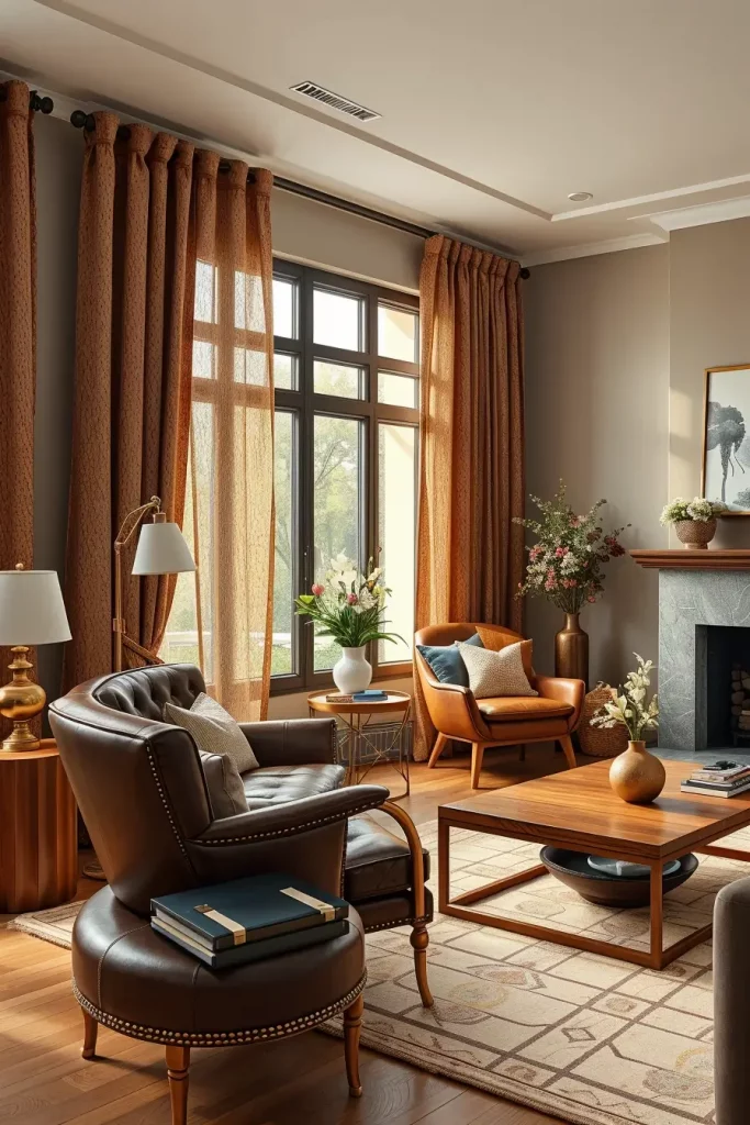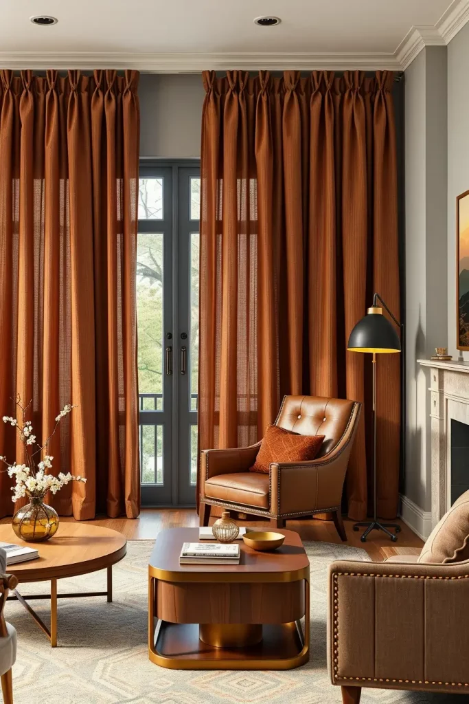 In my design around cinnamon brown curtains, I will have either the Textured Weave Curtains or Thermal Insulated Blackout curtains, which will provide the room with a sense of luxury. These curtains are well matched with leather furniture, cozy wood and woven fabrics. Especially, I prefer to add a caramel leather arm chair or a solid wood coffee table in window area to give the drapery a more luxurious look. Brass, matte-black curtain rods are also added to add the warmth.
