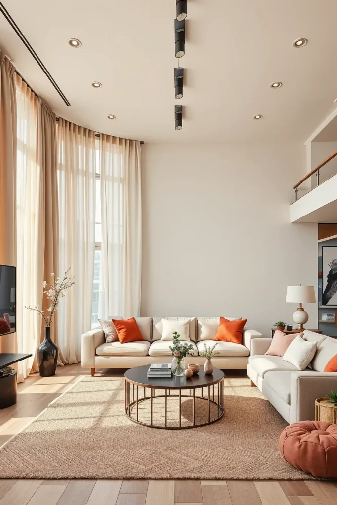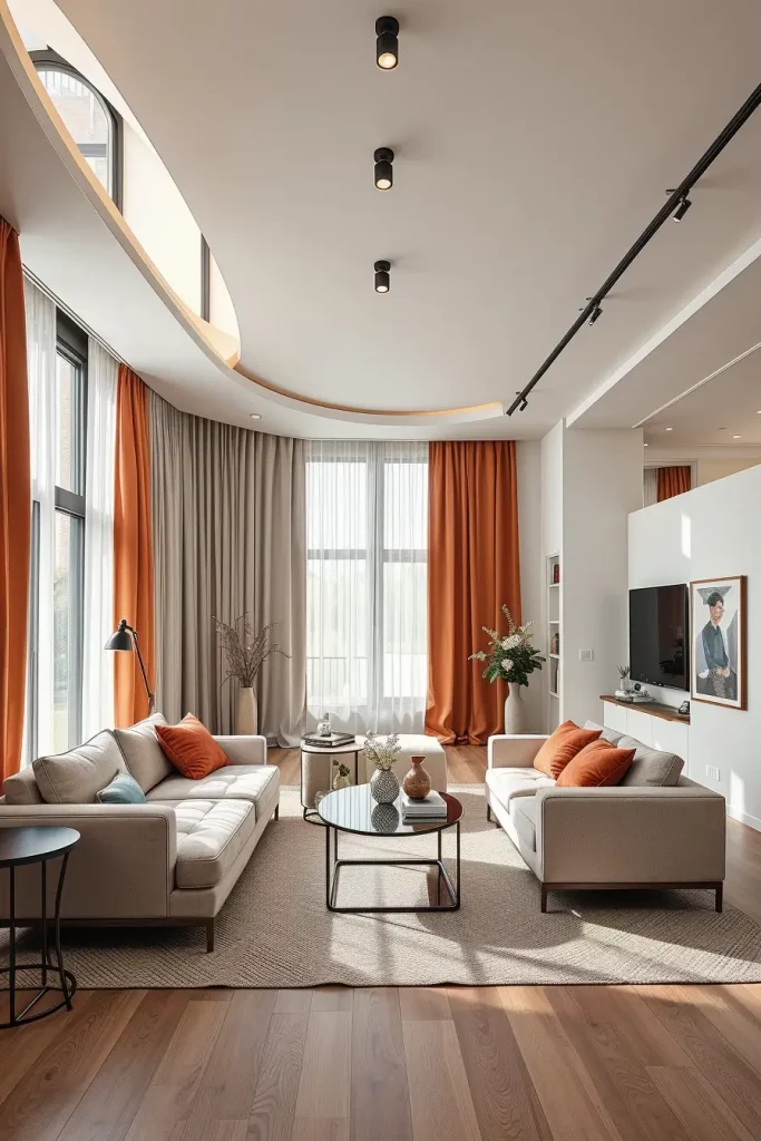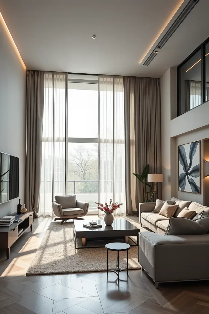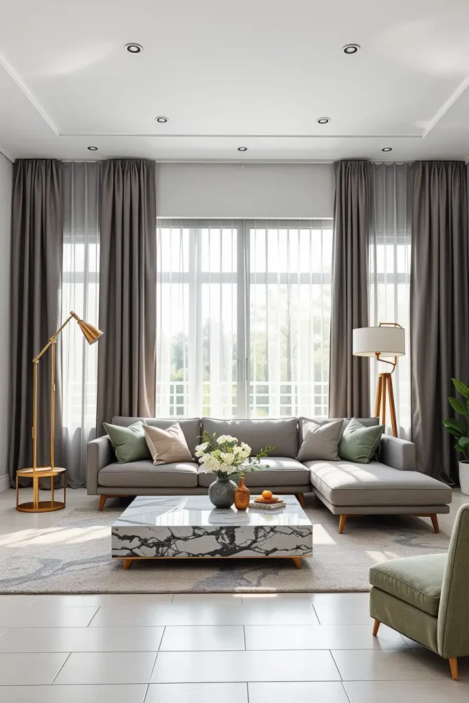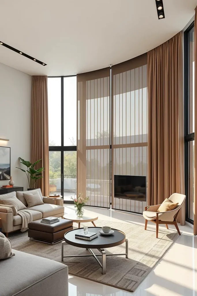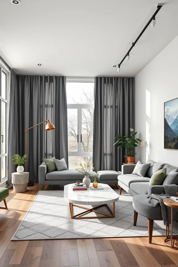 I usually use panel track curtains with contemporary furniture, i.e., a low-sectional sofa, a marble or stone coffee table, and tall floor lamps in the building. Sage Green or Terracotta accessories are also warming but do not break the minimalistic intent. The whole appearance is tidy and does not appear cluttered.
