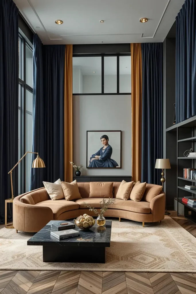 I prefer using velvet because it is a balance to sleek furniture: a slim console table, matte-black shelves, a curved sofa in a neutral shade of Warm Beige or Vanilla White can help to make the room not heavy-handed. Velvet is matched with metallic accents like brass lamps that are brushed or steel side tables.