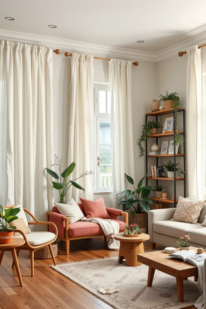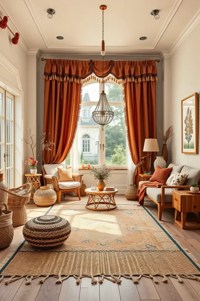 I would normally dress these curtains up with plump seating, rough throw pillows, natural wood furniture. The presence of a low coffee table, comfortable space carpet, and decorative materials, including ceramic vases or woven baskets, are some of the elements that add to a layered, artistic appearance. Splashes of Dusty Rose or Cinnamon Brown are added to add to the luxurious, bohemian-inspired palette, without overpowering the interior.