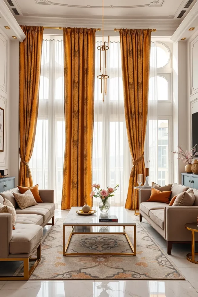 My favorite Textured Weave Curtains or Patterned Jacquard Curtains are used when adding mustard gold curtains to add the dimension to the drapery. I prefer to match them with mid-tone wooden furniture, plush and beige sofas and accent furniture in Cinnamon Brown or Sage Green. The warm-metallic atmosphere that compliments the mustard tones perfectly is combined with a brass floor lamp or a mirror with a golden frame. The mix of these elements makes the curtains rich and the palette of the living room unified.