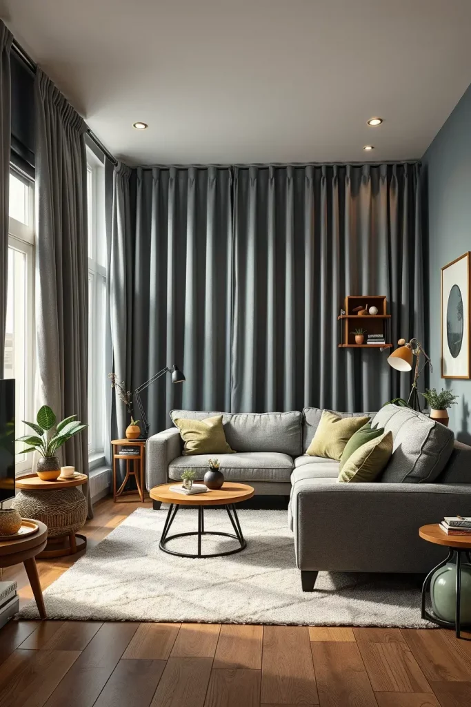 Since the blackout curtains may be perceived as too heavy, I tend to mix them with lighter pieces of furniture and cozy fabrics. The room is not too dark with a beige sofa, wood accents and natural-fiber rug. The use of smooth curtain rods and minimal decorations can be used to ensure a sleek modern appearance although still enjoying the benefit of the insulation advantage.