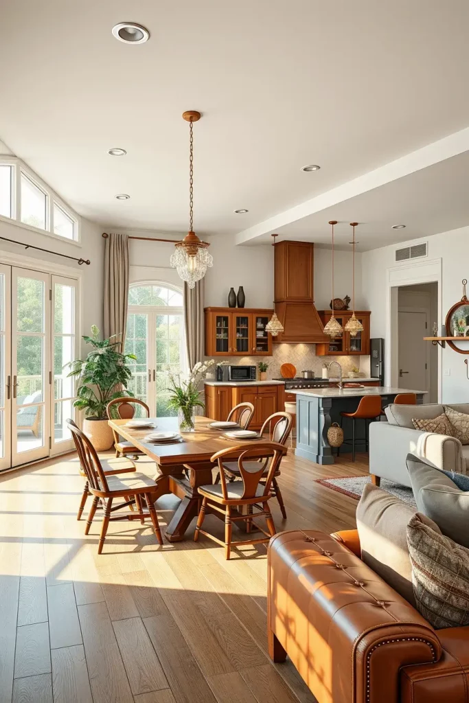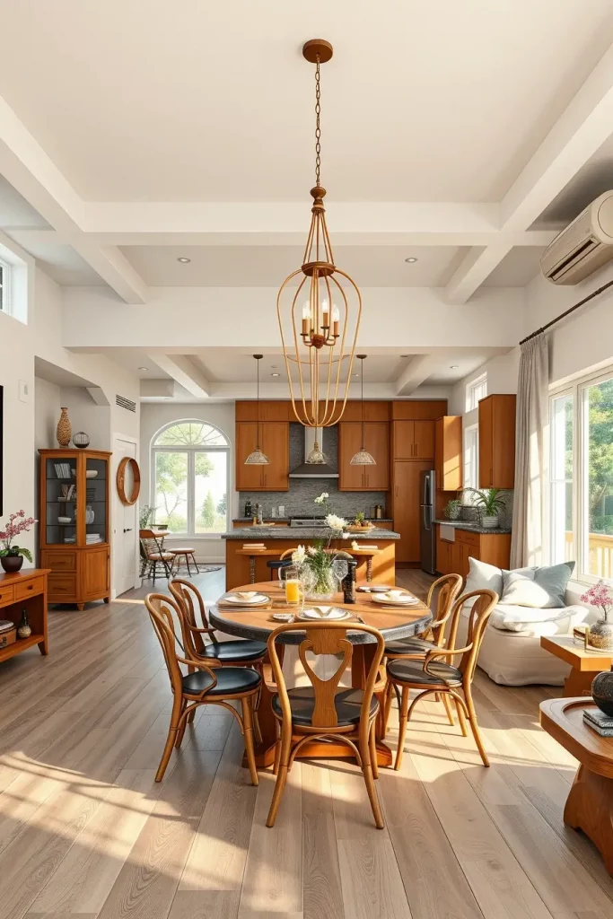 I am fond of including an extendable dining table that will match the design of the kitchen island. The lighting used to divide the dining area is in the form of pendant lights or track lights which do not break the openness. Easy seats and uninterrupted flooring increase the unification of space, and warm colors such as curtains or carpets are used.