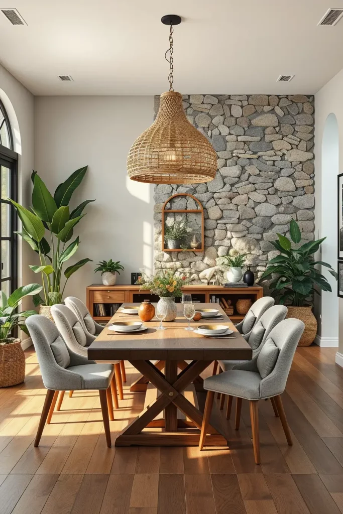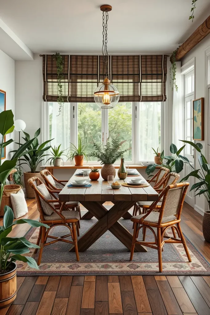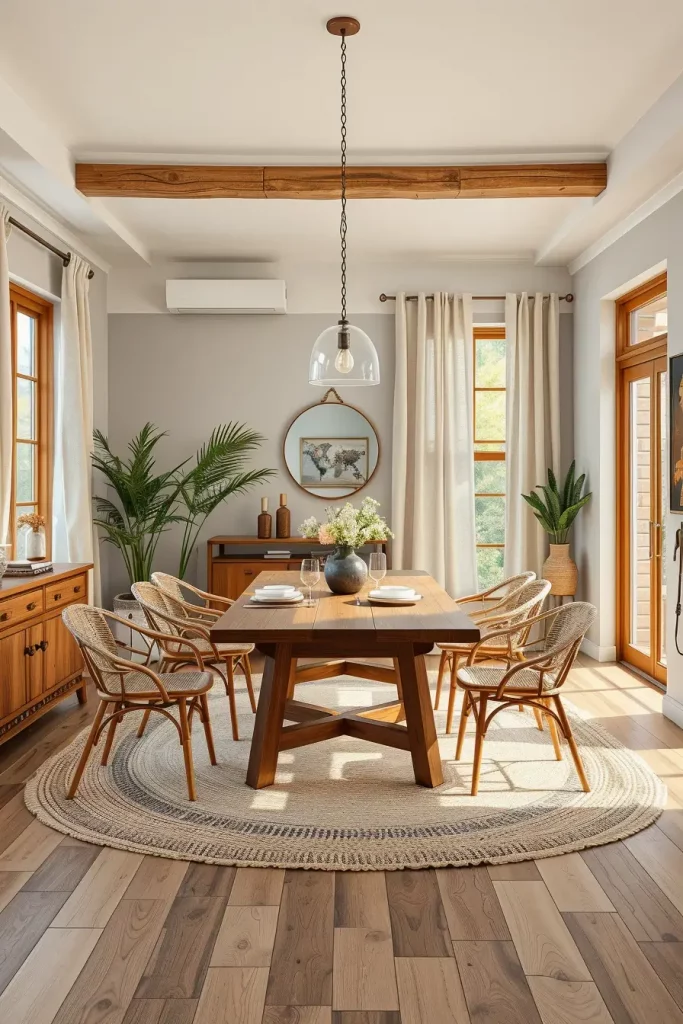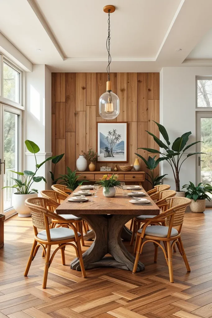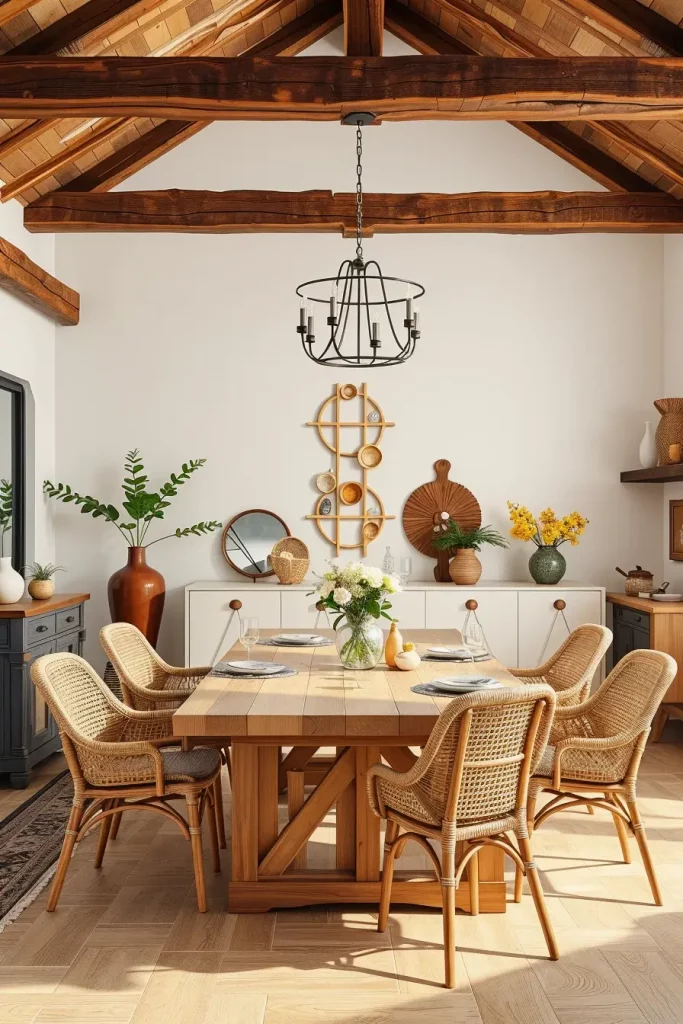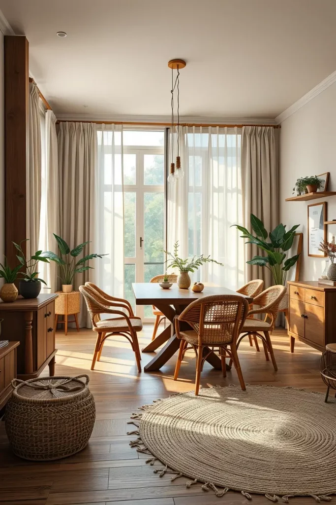 Another factor that I consider when selecting furniture in this design is sourcing wood and metal accents that are recycled and of an ethical origin. I can give an example of a dining table with reclaimed oak and rattan-backed chairs, I just adore the contrast between the texture of the surface and the one of the chairs, which are fresh and at the same time sophisticated. The jute or hemp rug would only serve to add to the organic feel without losing the design.