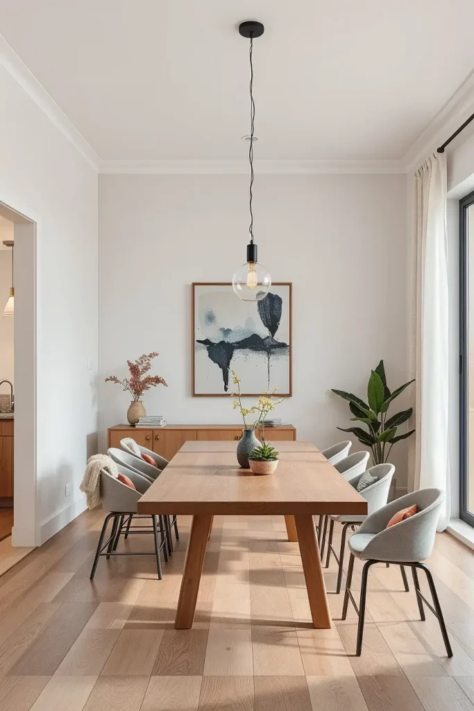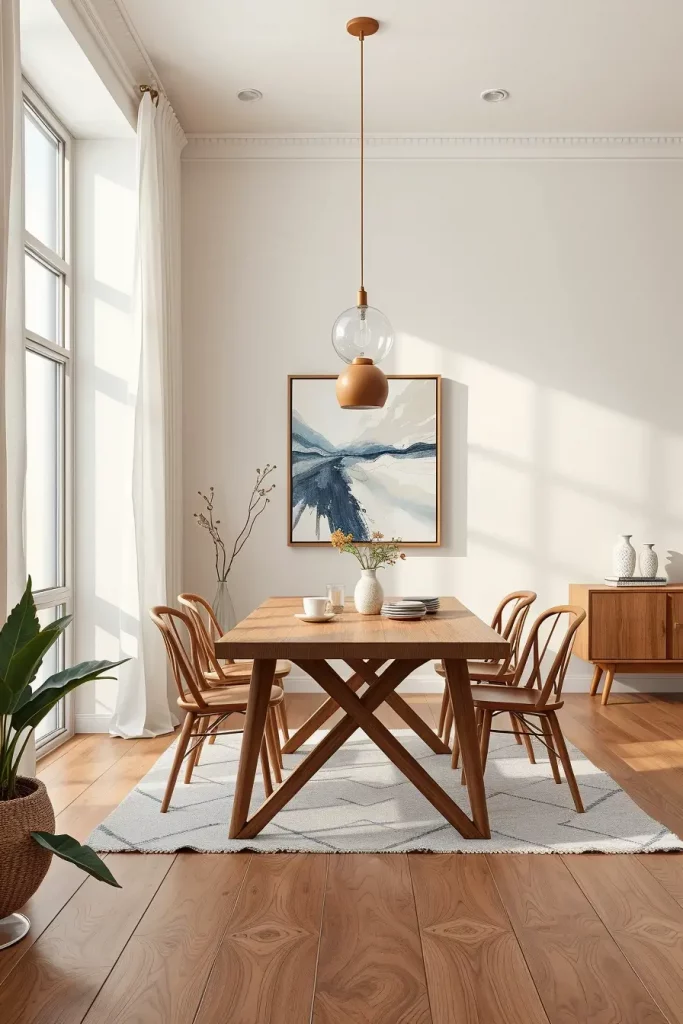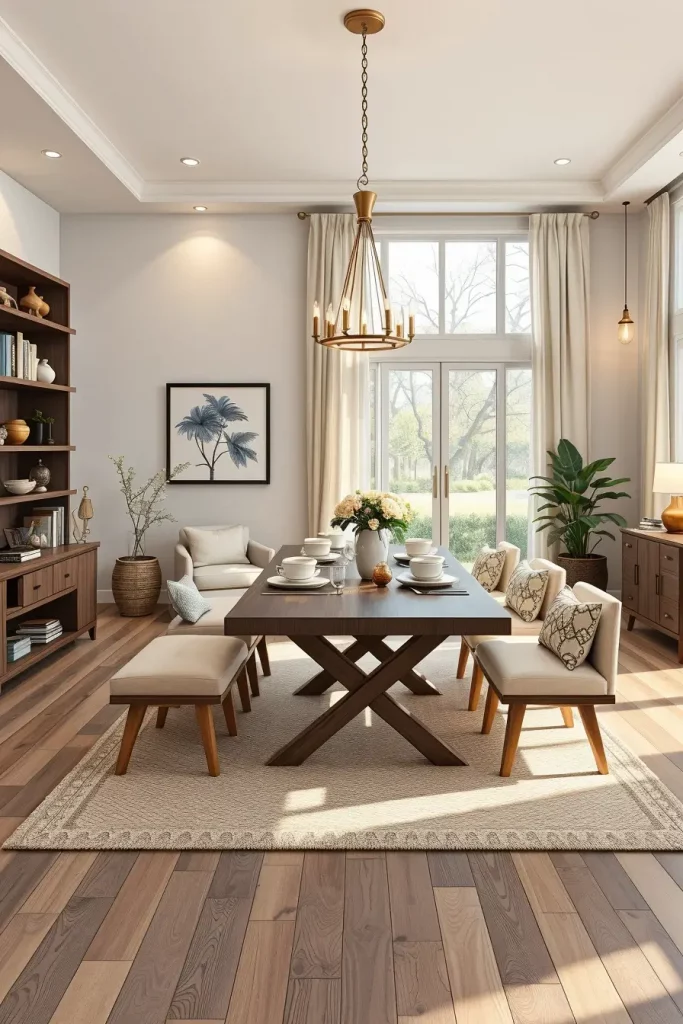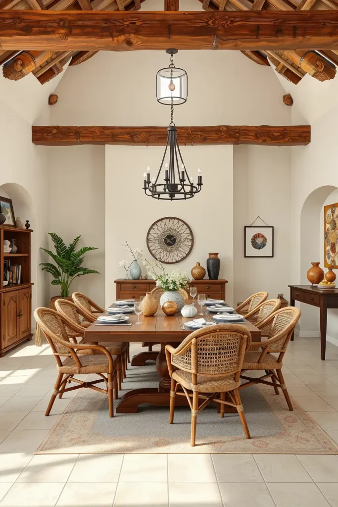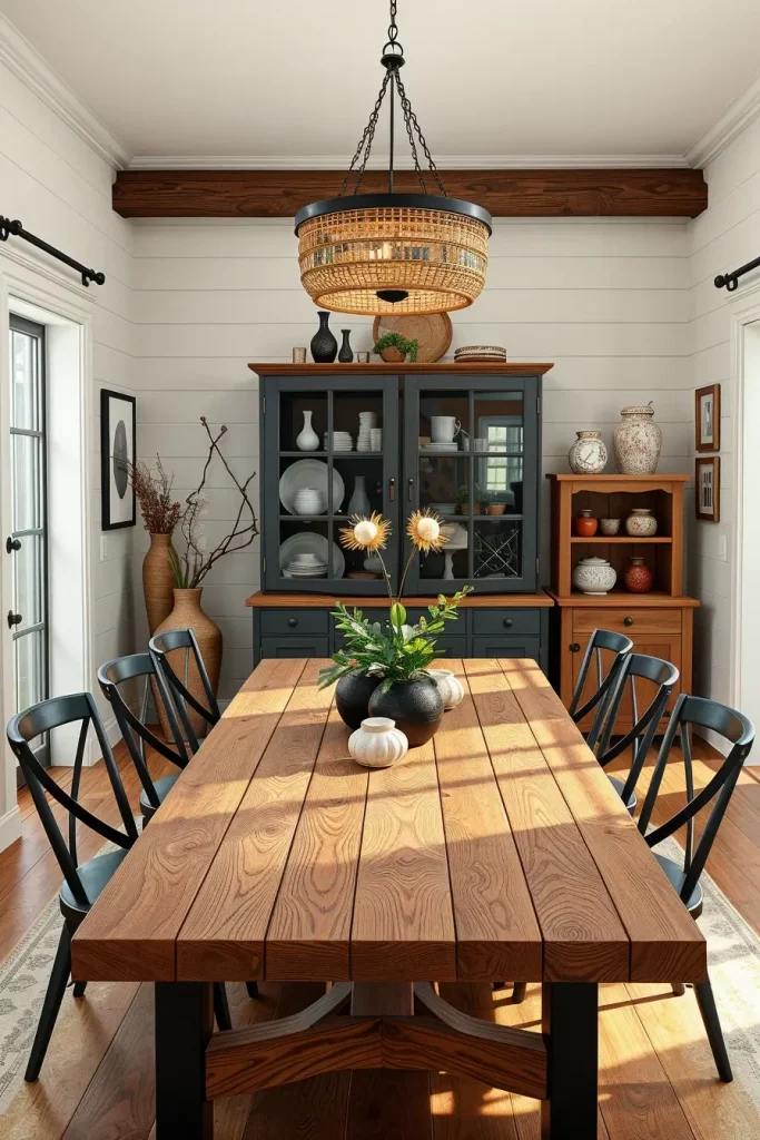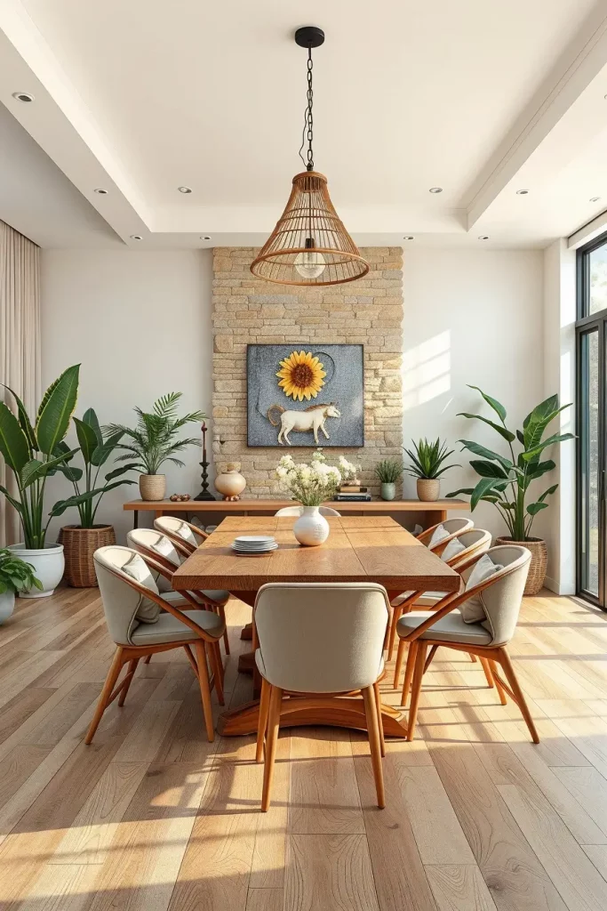 At the center of this plan is a big wooden table on which cross-back chairs and a plain linen runner will be used. I usually hang a large wrought iron chandelier or woven pendant overhead and this seems to give it a rustic but modern tone. I complement the decor, with ceramic vases, the vintage-style wall art, and greenery, the minor details that bring the space to life.