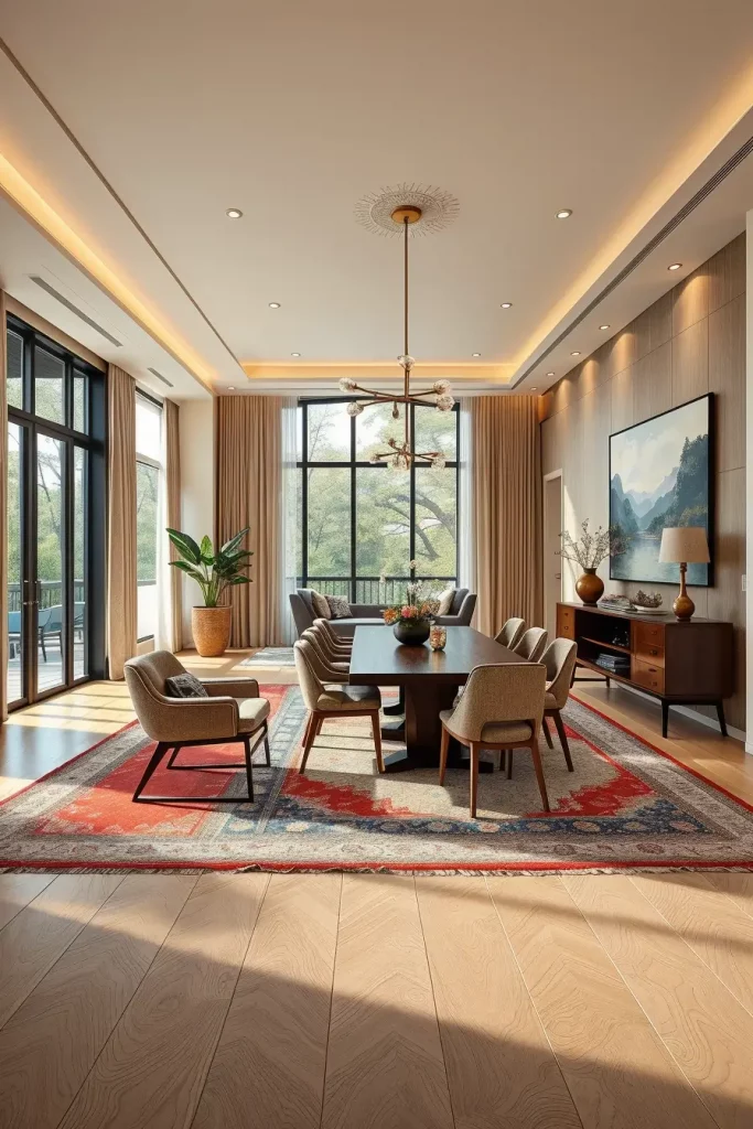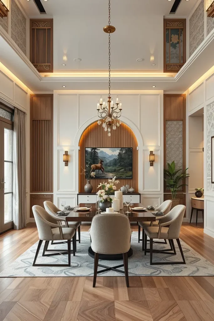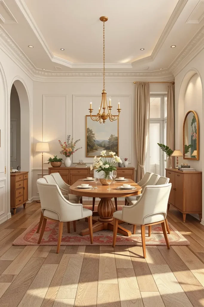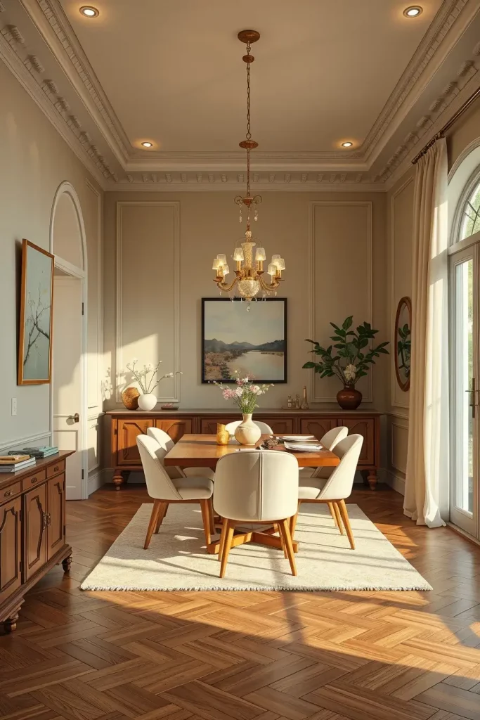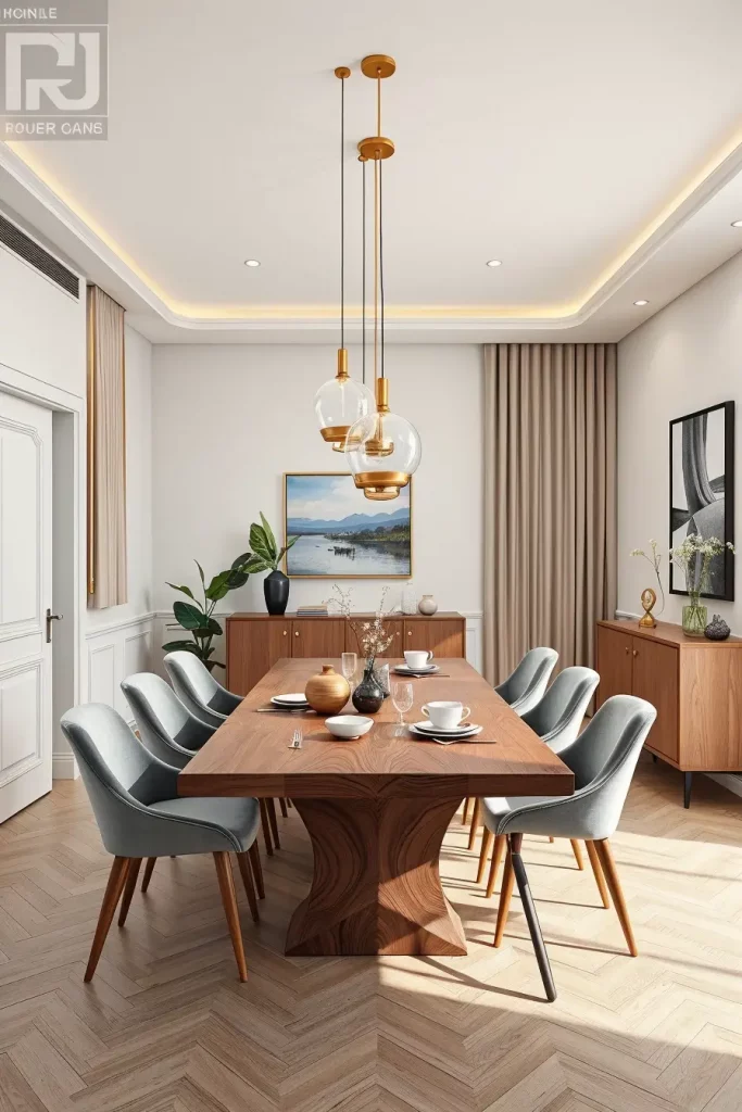 When it comes to furniture, I will give priority to more ergonomic dining chairs that have cushioning seats, curved backs that make one relax. The layout can be softened by a round dining table that will make guests start talking. Additional elements of decor, such as a textured flooring, warm metallic details, and stacked lighting, including pendant and ambient lighting are added to the appearance. The concept will consist of making the dining room comfortable and classy enough to host special occasions.