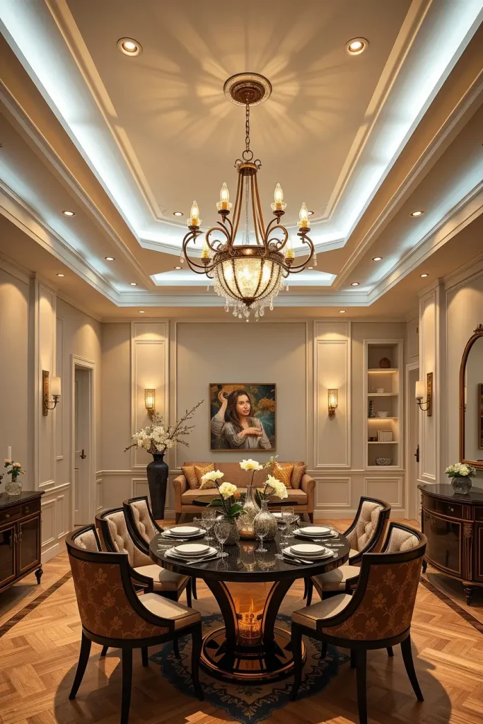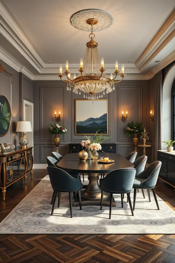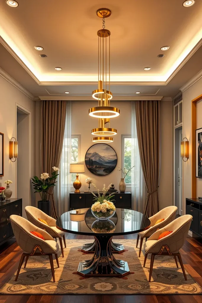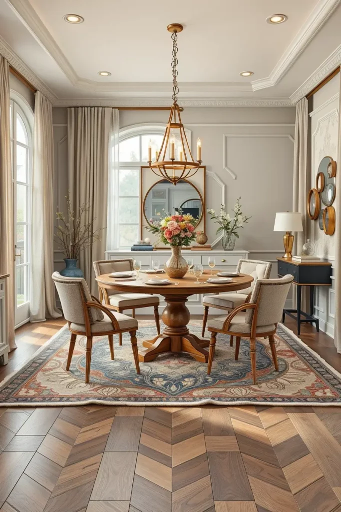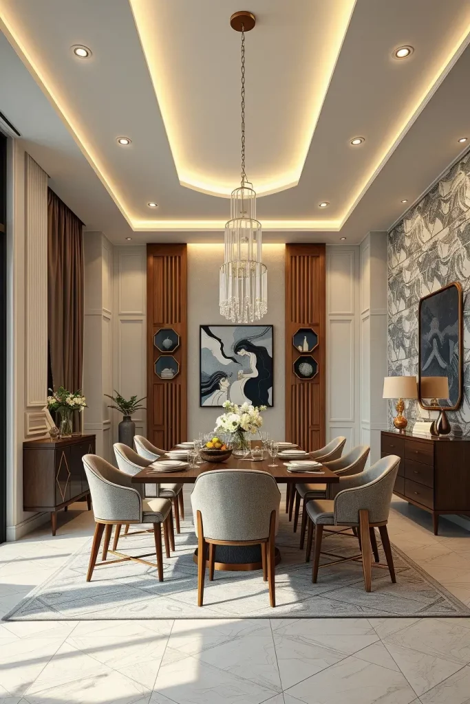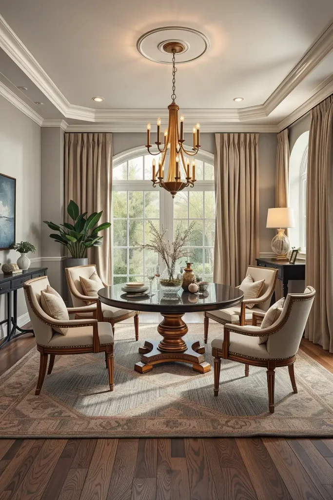 When it comes to furniture, I will give priority to more ergonomic dining chairs that have cushioning seats, curved backs that make one relax. The layout can be softened by a round dining table that will make guests start talking. Additional elements of decor, such as a textured flooring, warm metallic details, and stacked lighting, including pendant and ambient lighting are added to the appearance. The concept will consist of making the dining room comfortable and classy enough to host special occasions.