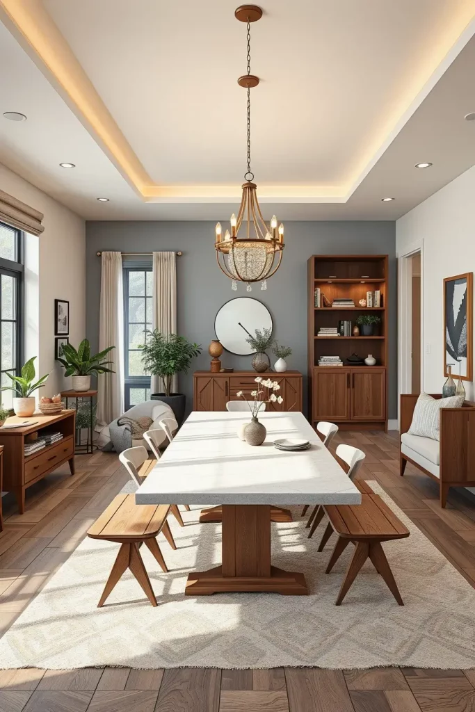A combination of materials is among my most preferred methods of remodeling a dining room to appear modern and layered. This direction in 2026 will be focused on the contrast between natural and industrial finishes, wood, glass, stone, and metal will co-exist with harmony. It is important to find a balance of visuality and haptic interest.