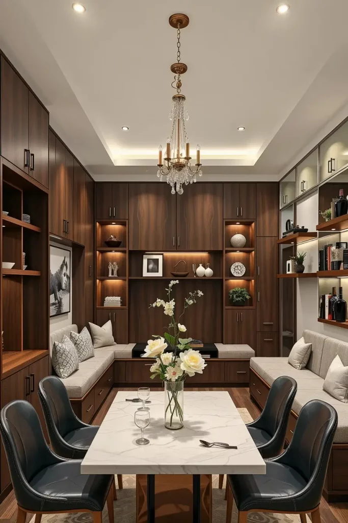 Generally, I would suggest wall-to-wall storage units that have glass fronts when it comes to holding tableware or collectibles. Shelves can be mounted on the wall and put on the floor or beat up under the bench; slim consoles with push-to-open may be used maintaining the minimalist look, leaving the things needed in everyday life near. This is aimed at making sure that functionality does not disrupt the design of the dining room.