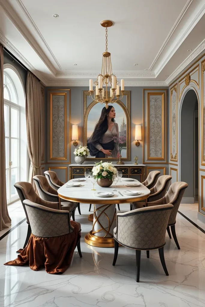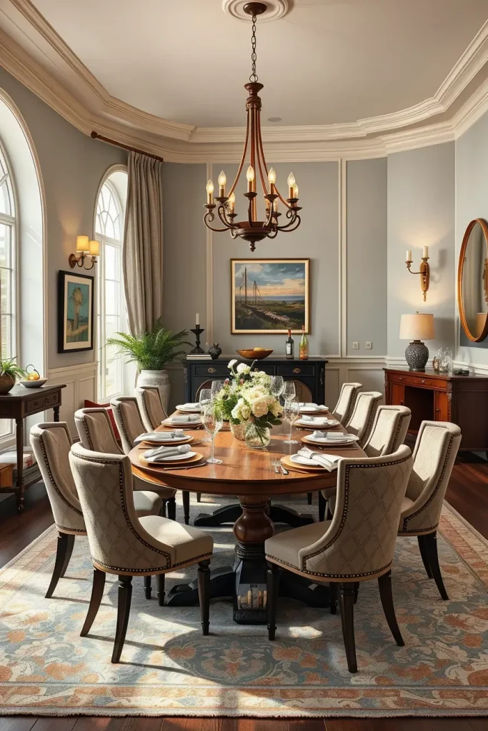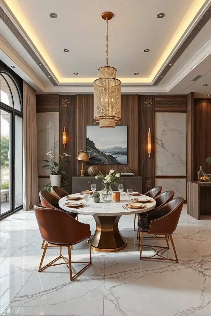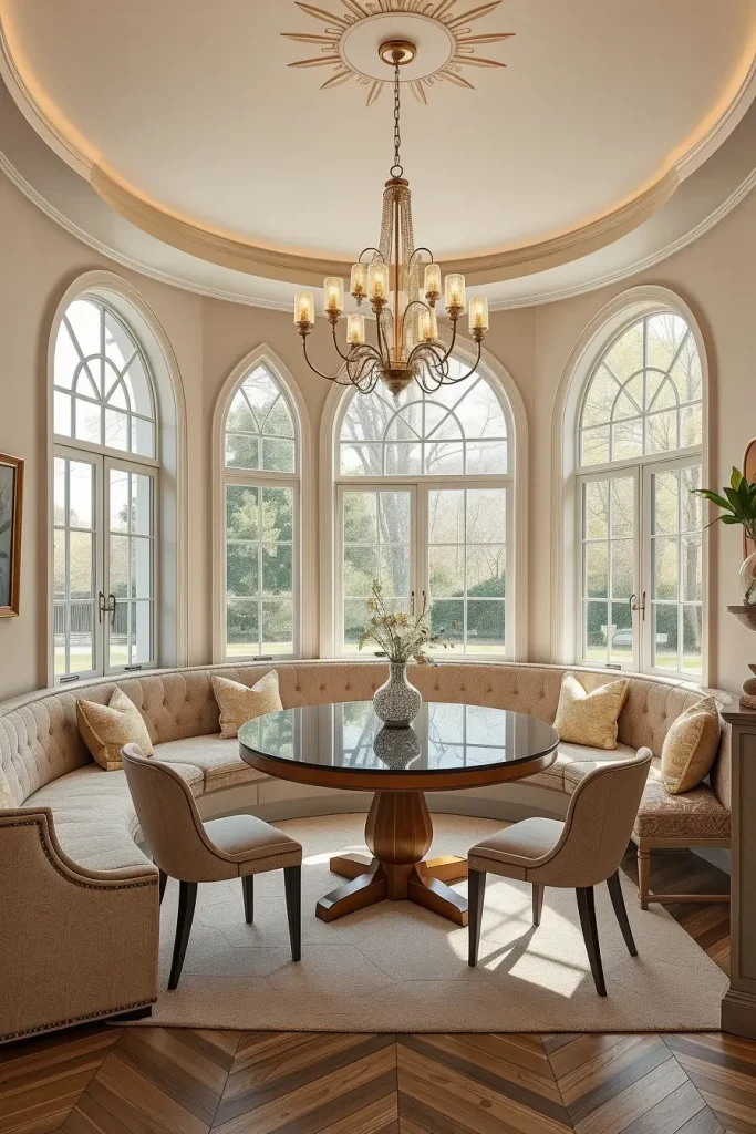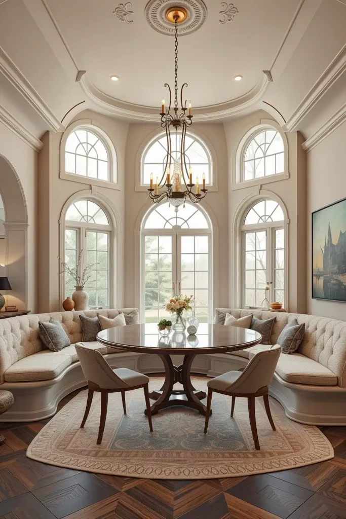 Another combination that I enjoy to use is the round or oval dining table with a banquette that is curved and upholstered with either boucle or leather. It brings about the feeling of closeness and contemporary touch. The presence of sculptural chandelier is an addition that adds rhythm to the sight, bringing all the elements together.