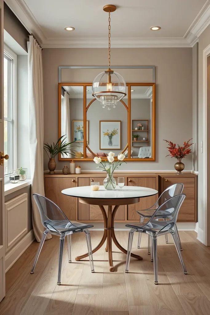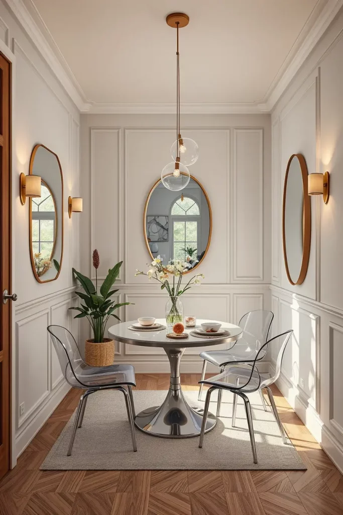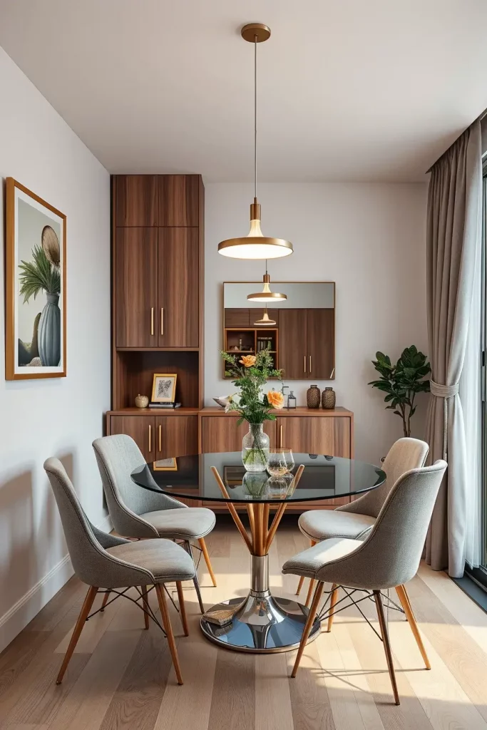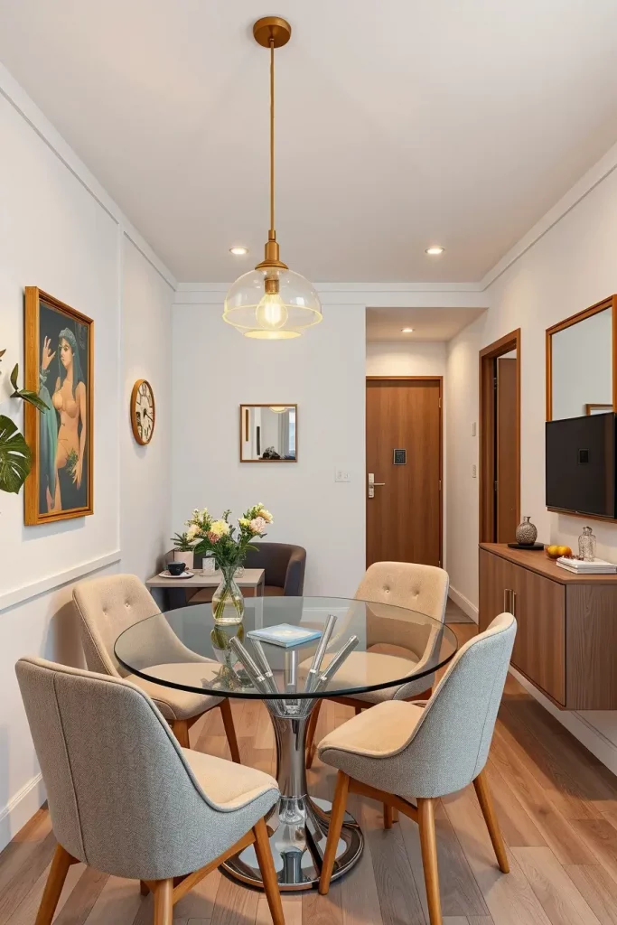 I can give the example where once I created an apartment in a dining nook into a round glass table with slim metal legs, complemented with the use of upholstered chairs in a neutral color. The space was characterized by a pendant light over the table with the help of a mirror on the opposite wall that created depth and intensity. The space was also clutter free in compact storage solutions such as a floating cabinet.