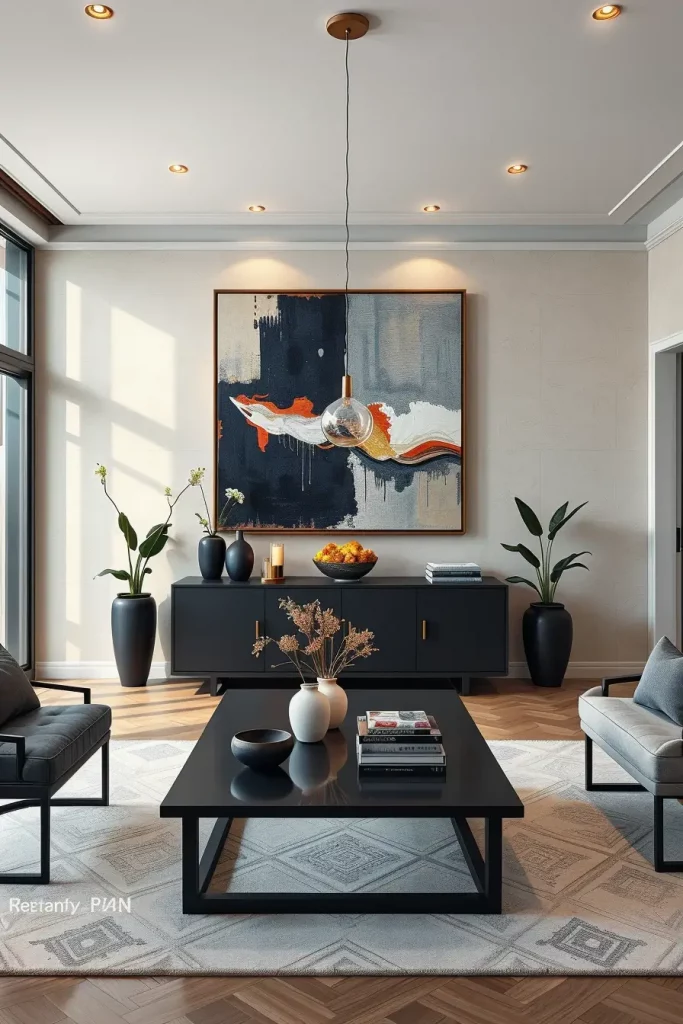 I would also add to this style abstract wall reliefs or statement console of marble or metal to give the sculptural story complete.