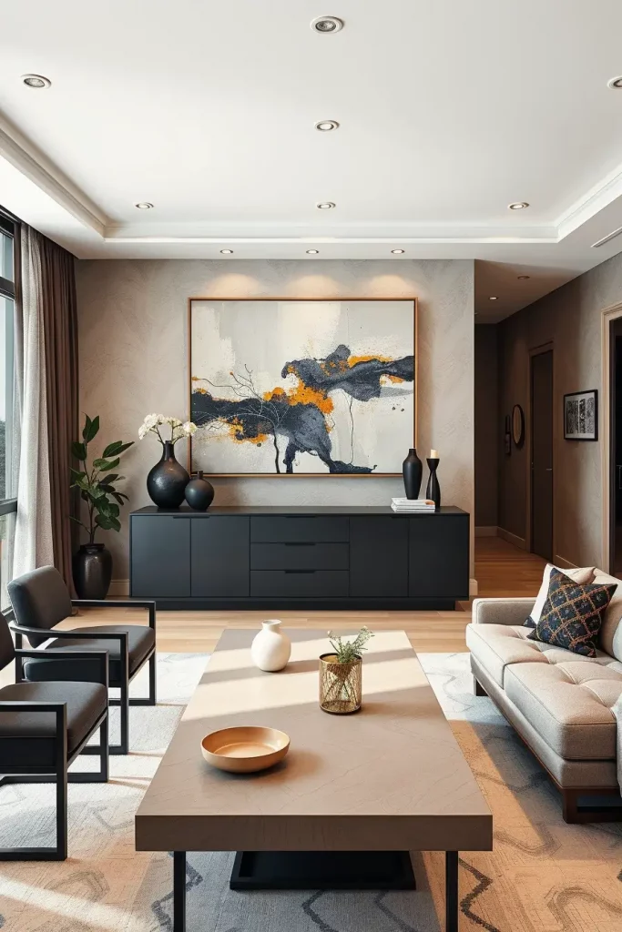 In one of my favorite designs I took a 6-foot-wide canvas with violent brush strokes to hang over a credenza that is minimalist. This piece of art served as the soul of this room to the perfect equilibrium of smooth furniture and neutral colors. To frame the piece, I did not overpower it with distracting details and used matte black frames and understated metallic details that add depth and do not distract.