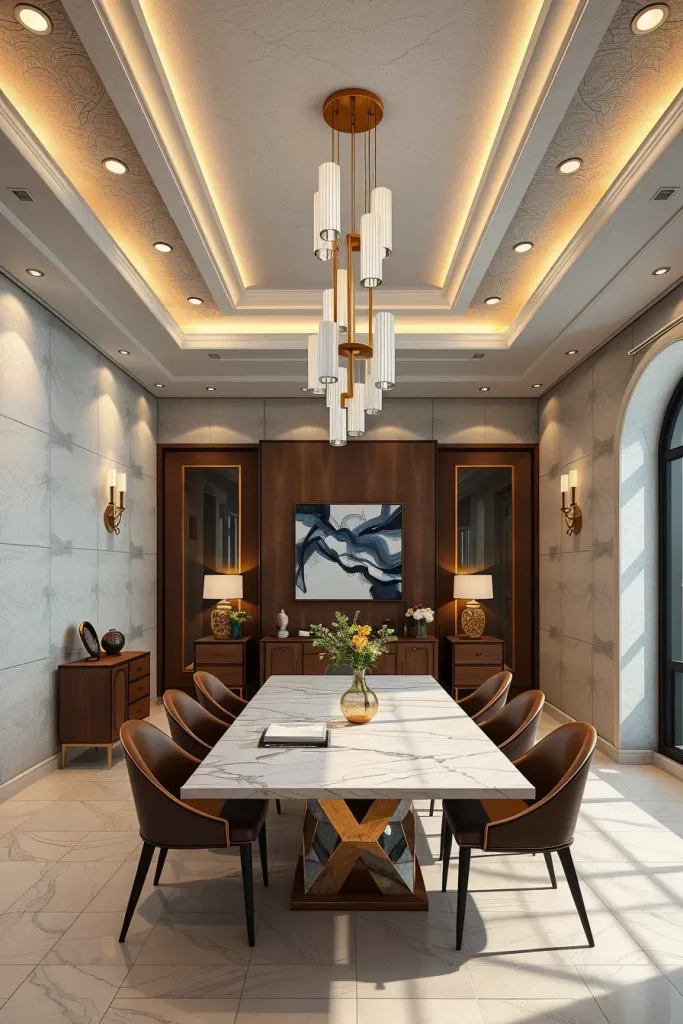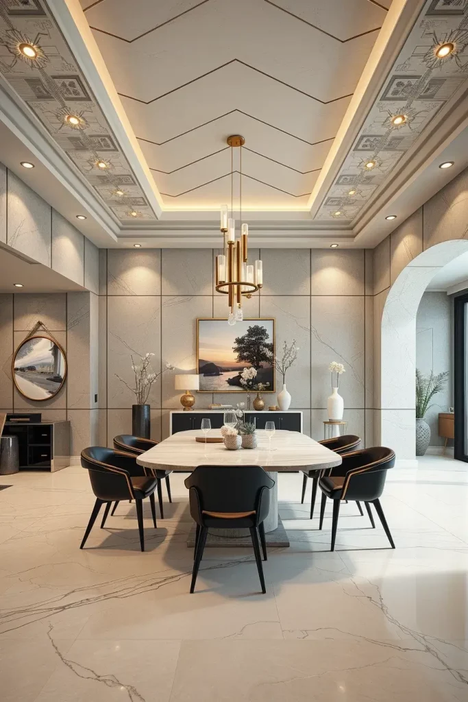 As an illustration, I have recently created a dining space with a moulded ceiling, having soft curves and inbuilt LED lights. Microcement was also used to finish the walls to make them textured and durable. The richness of touch on these surfaces was balanced with modern sophistication by my matching it with a marble dining table and leather-upholstered chairs.