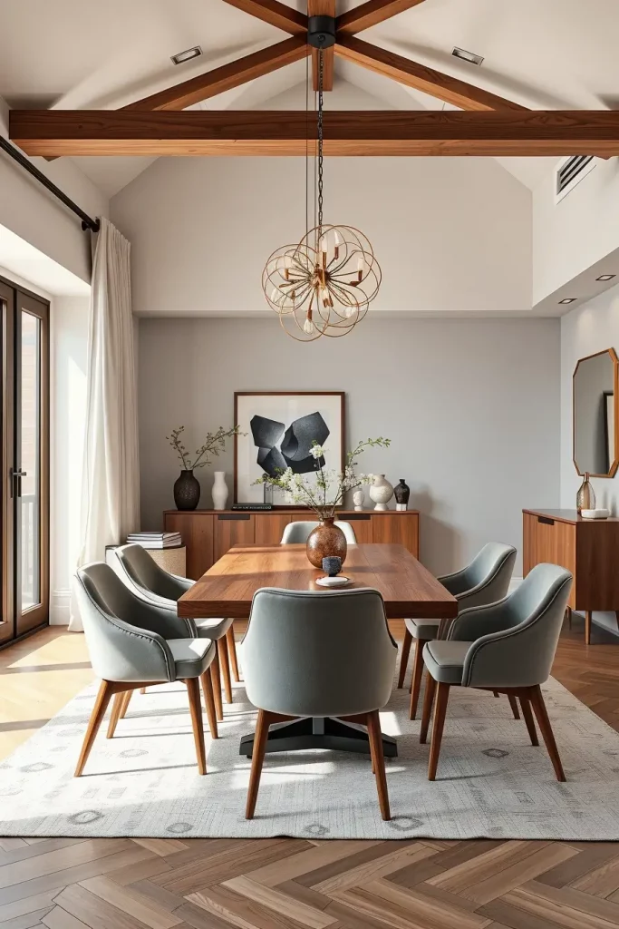 I had chosen a round-edge dining table, which has metal legs and velvet chairs in my recent remodel. The mixture was very classy and touchable without being excessive. A smooth sideboard and a sparse pendant light provided functionality and the aspect of balance.