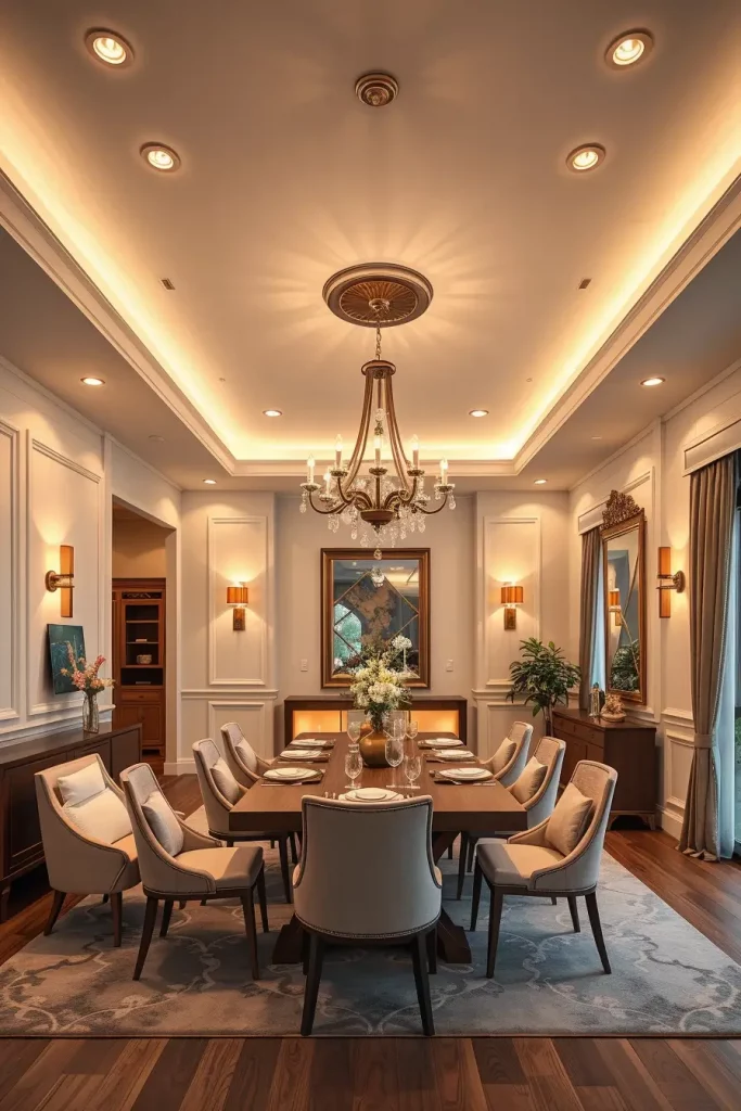 In a recent remodel of mine, recycled ceiling lights that provided even base lighting, a sculptural pendant above the table as a dramatic element and wall sconces to give soft directional light. I added LED strips hidden behind floating shelves and wall panels to complete the entire process and have a soft diffused light. This combination allows the dining area to be versatile with casual dinner and formal parties.