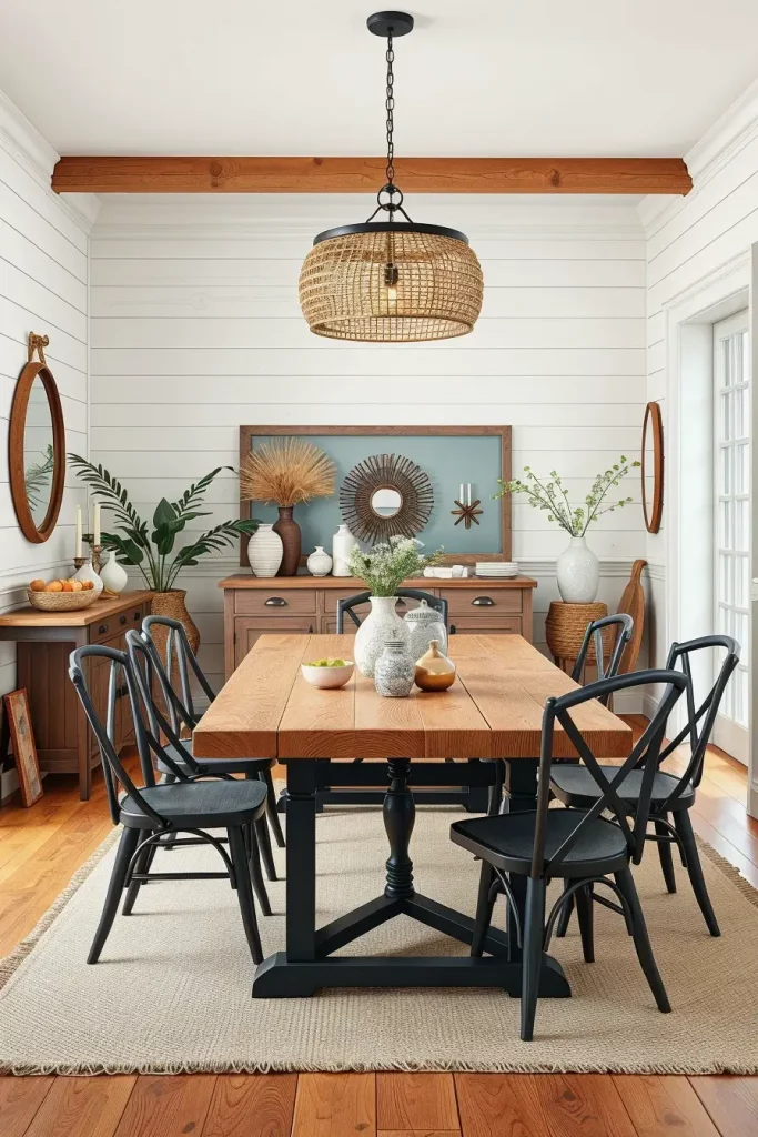 I have always liked a modern farmhouse dining room it is a style of dining room that is both nostalgic and new. The designers are reinventing this appearance in 2026 with less gritty lines and more natural materials and contrasts. I prefer the base of a neutral backdrop: shiplap walls which are white, light oak floors and black metal ornaments to balance the neutral background.