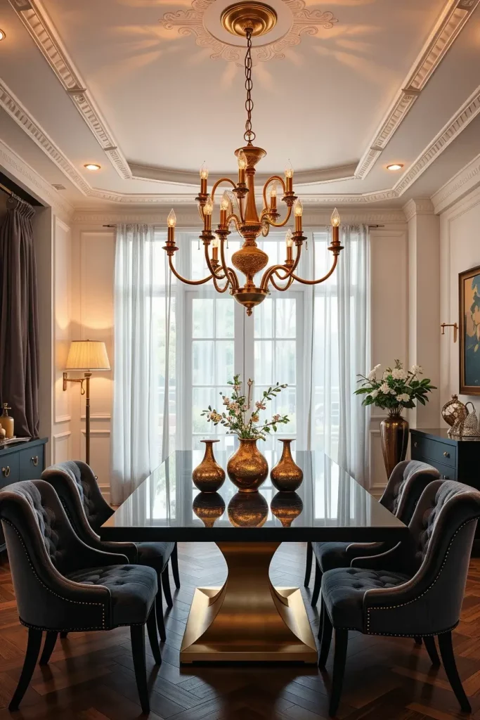 During one remodel I mixed a brushed brass chandelier and dining chairs with a chrome base which was smooth. I selected a matte black table and loose velvet interior in warm colors in order to match the metallic sheen. Several ornamental objects – such as a metal bowl or sculpture candlesticks – came in handy to bring it all together.