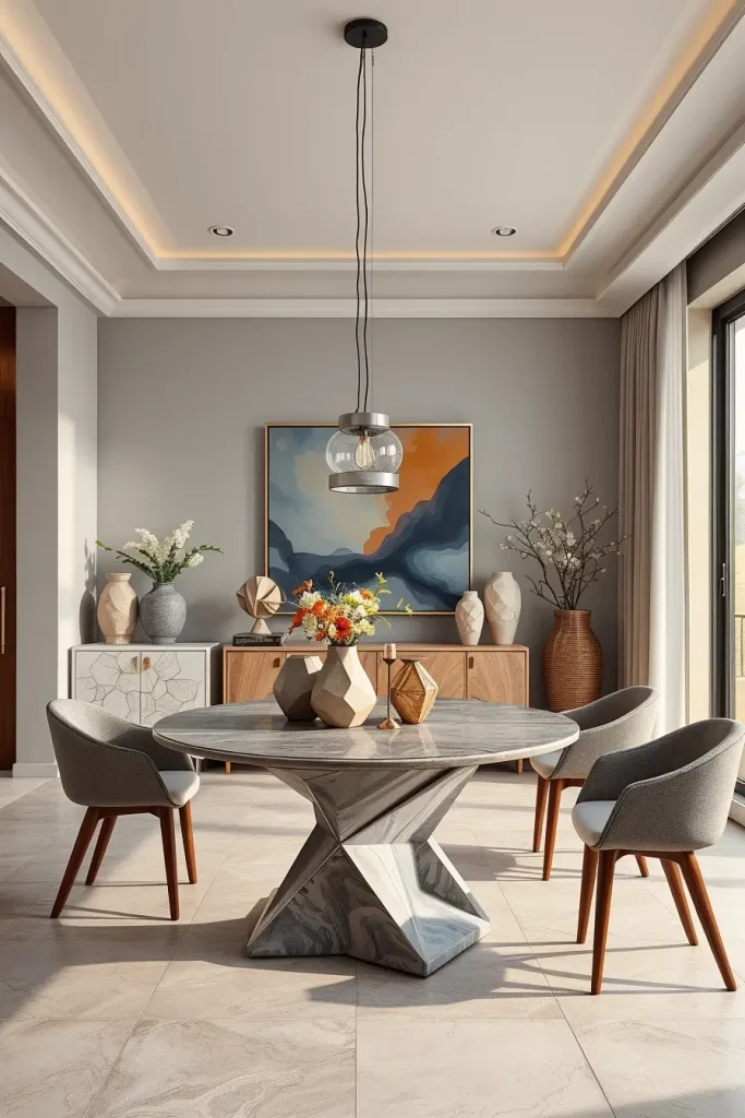 In one of them I also included a sculptural base of a dining table and asymmetrical pendant lighting which served as a modern art piece. I placed ceramics sculptures and geometric vases on the sideboard, which went well with the neutral color of the room. It produced an effect of a room that was both discussing and relaxing.