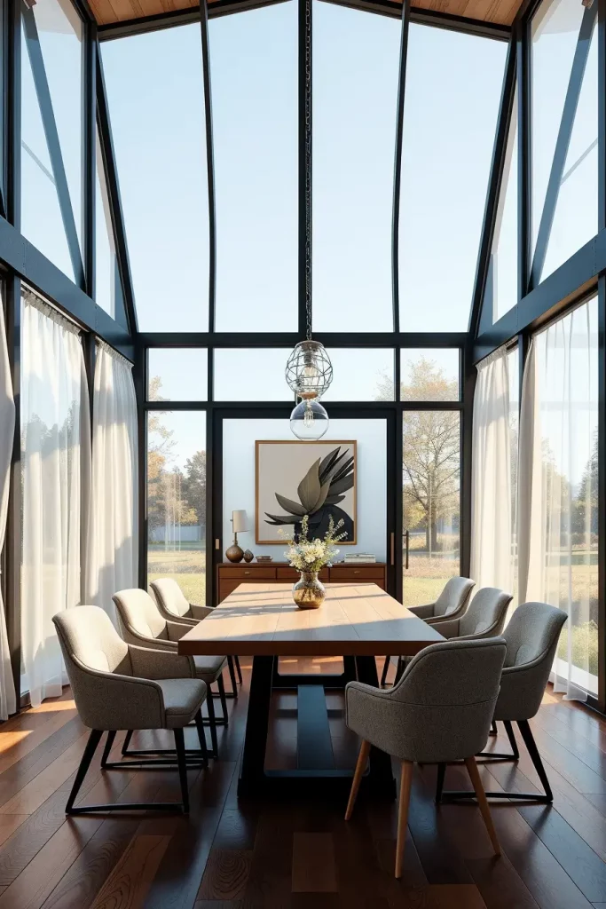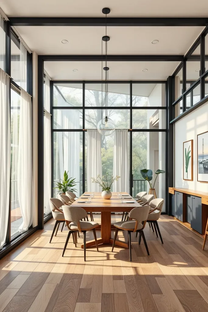 Concerning furniture, I would prefer neutral upholstered chairs with light wood dining tables to balance the high amount of sunlight. The room has a simple pendant light that is located above the table: this guarantees the room is functional in the event of night and at the same time during the day, the room is in harmony. Thick, transparent drapes may be used over each other in order to keep privacy intact and views bright. Placing a statement rug under the dining set will bring some visual definition, and leave the room grounded.