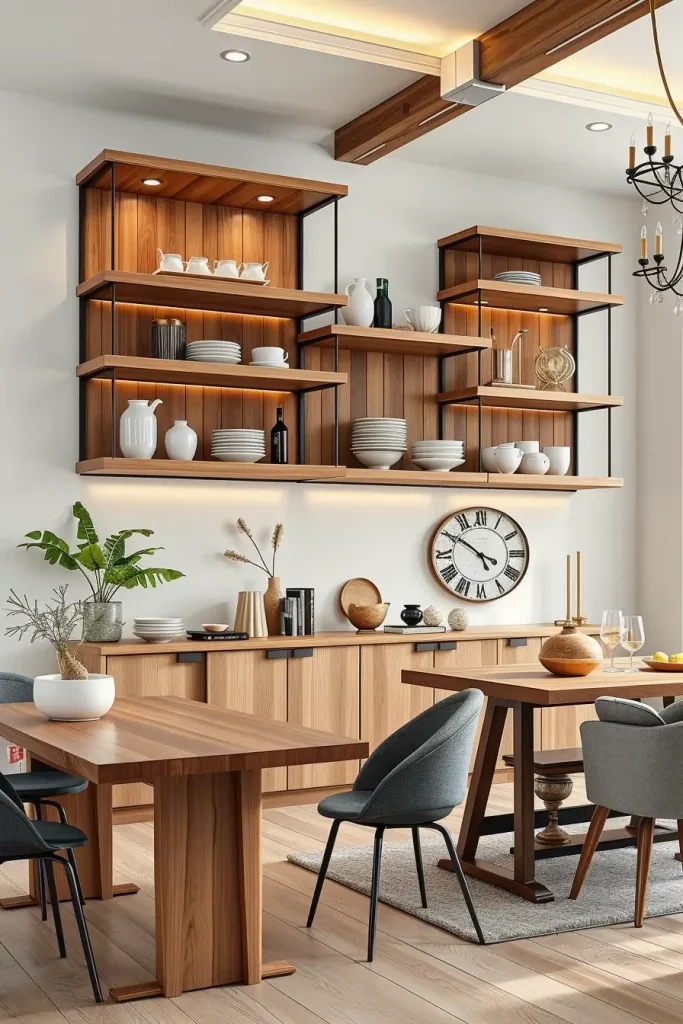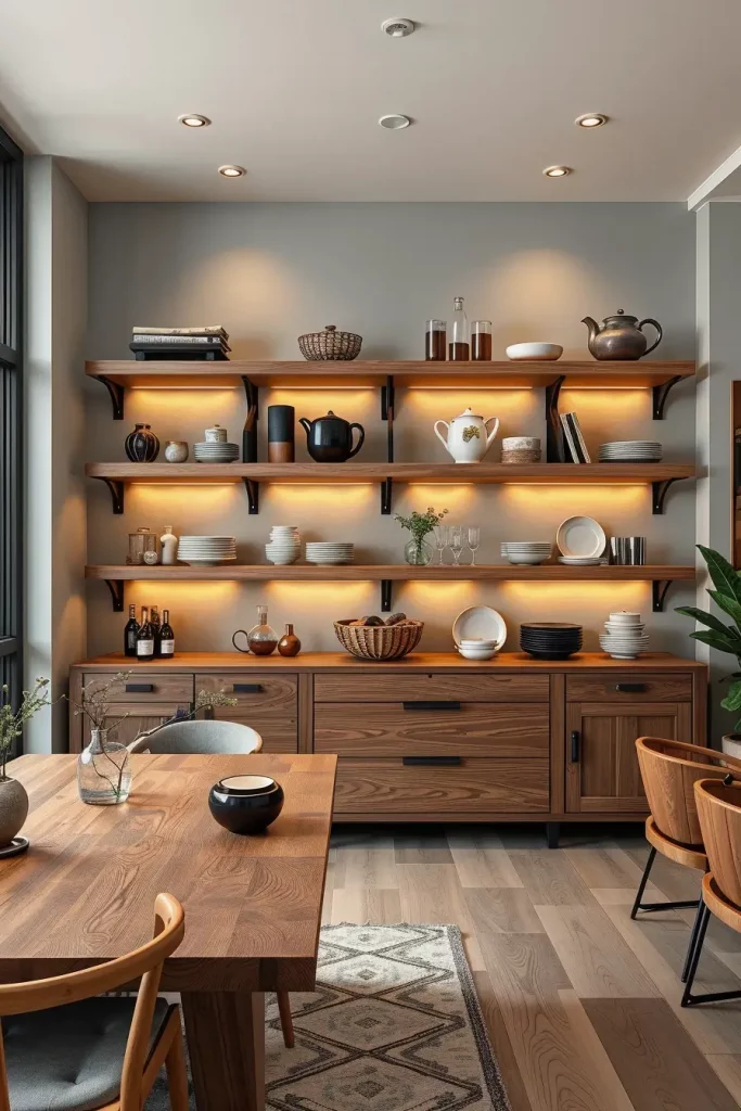 I usually suggest floating wooden shelves that have in-built LED strips underneath them. They emphasize your best things as they bring a warm glow throughout the evening meals. The combination of natural oak or walnut shelves and matte black brackets is a modern contrast that suits most of the dining rooms. Additional closed storage facilities can be had on a nearby sideboard or cabinet holding less display worthy items.