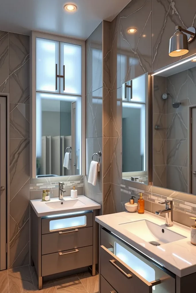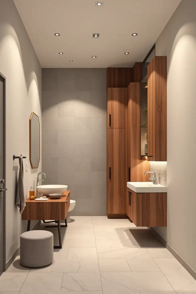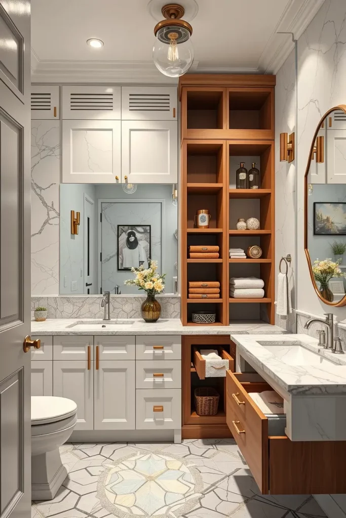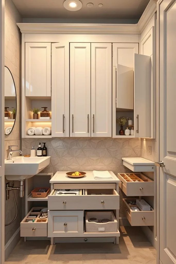 I will usually incorporate narrow shelving towers, mirrored medicine cabinets, and vanities with long deep drawers that enable them to store themselves effectively. Folding compartments and corner shelves, integrated cabinets are also instrumental in utilizing as much area as possible. Bright lighting, lightweight finishes and reflective surfaces will make the room visually bigger making even the tiniest bathrooms look open and comfortable.