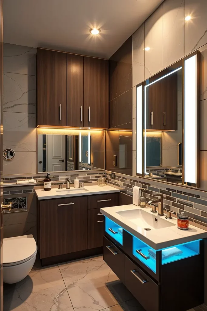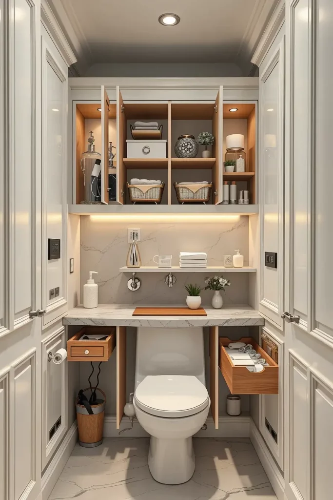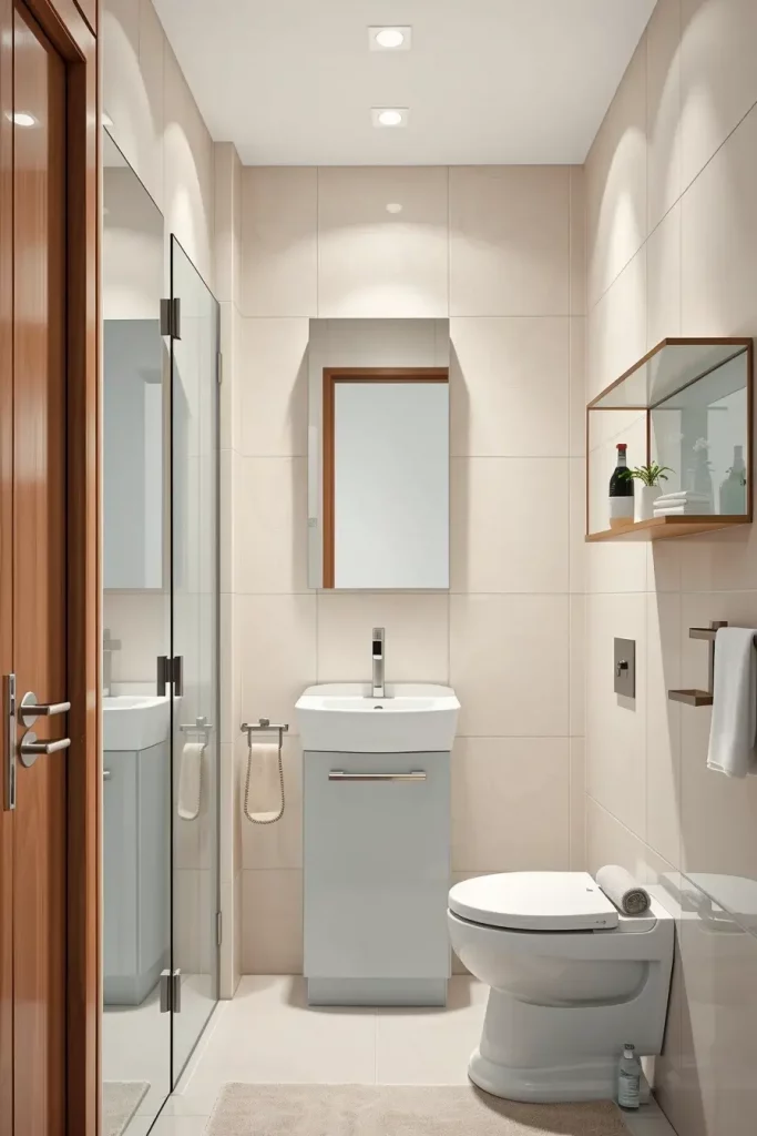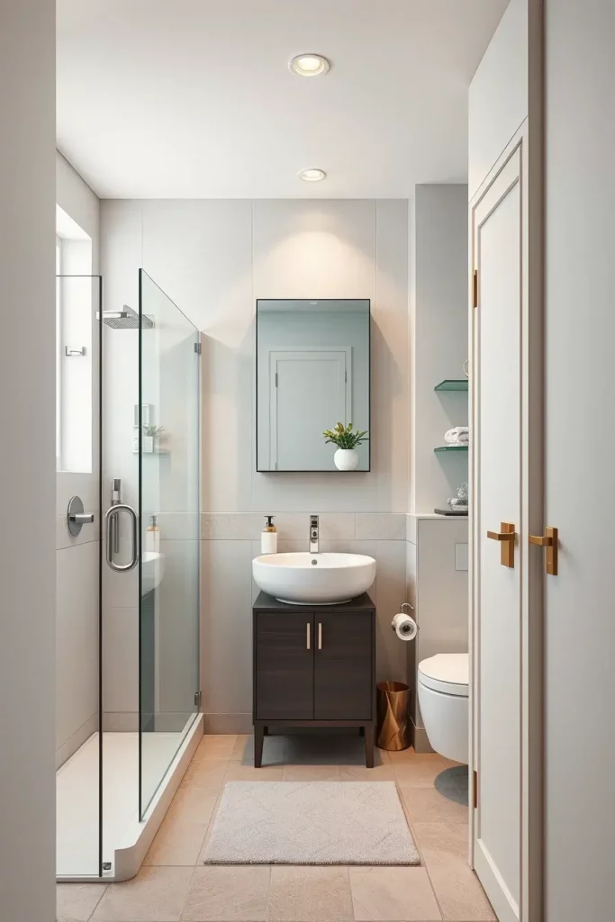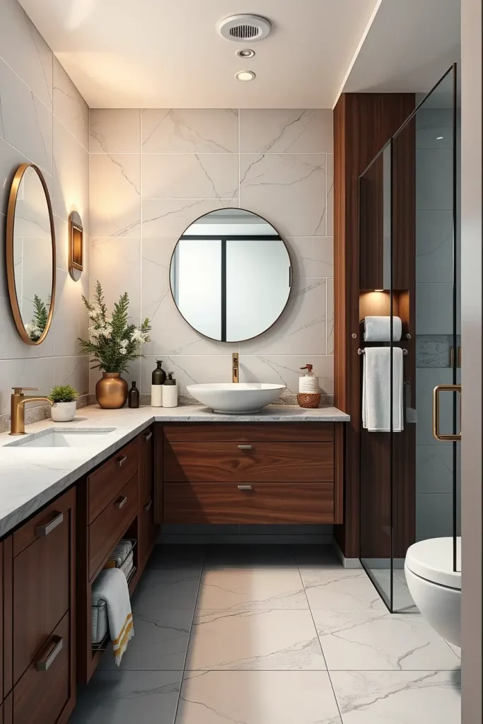 I will usually incorporate narrow shelving towers, mirrored medicine cabinets, and vanities with long deep drawers that enable them to store themselves effectively. Folding compartments and corner shelves, integrated cabinets are also instrumental in utilizing as much area as possible. Bright lighting, lightweight finishes and reflective surfaces will make the room visually bigger making even the tiniest bathrooms look open and comfortable.