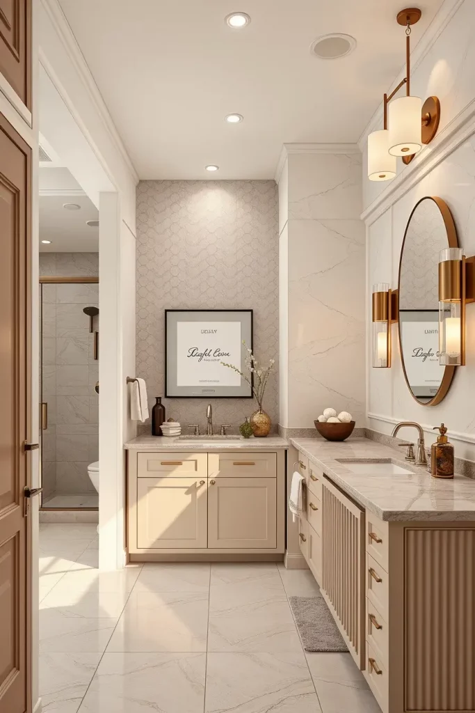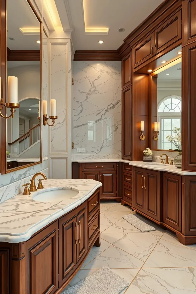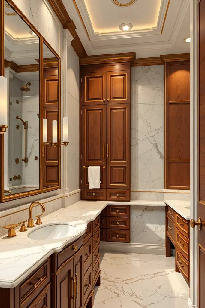 I usually use solid wood cabinets, marble tops, brass or brushed gold fittings and built in lighting that emphasizes the craftsmanship. Other details including full-wall mirrors, book-matched stone and luxury fixtures finish off the luxurious appearance. Furniture is fashioned to match such appliances as a built-in towel warmer or accent lighting under the cabinet creating a layer of hotel ambience.