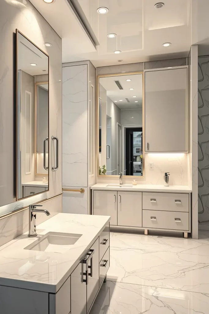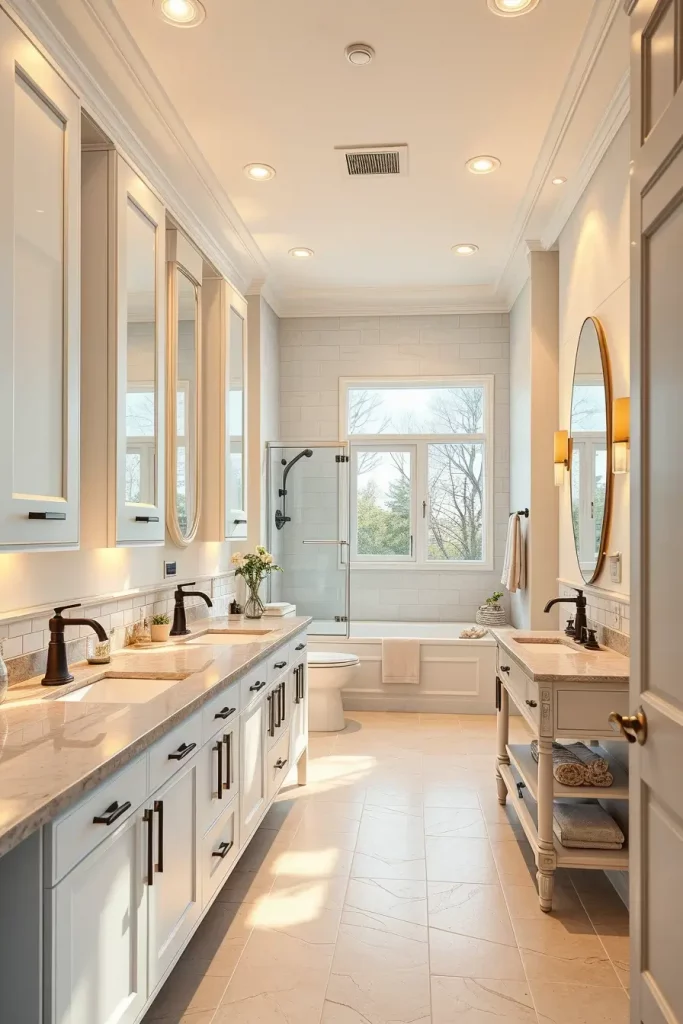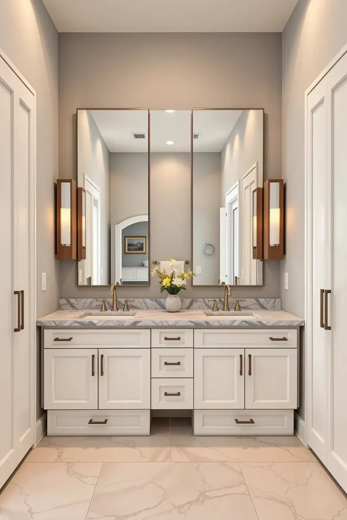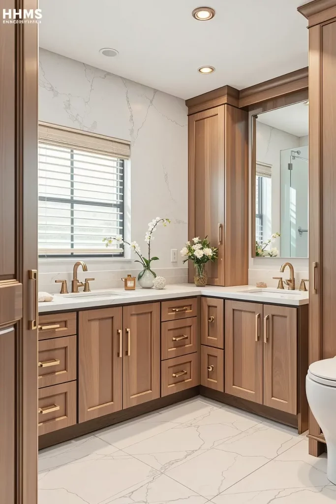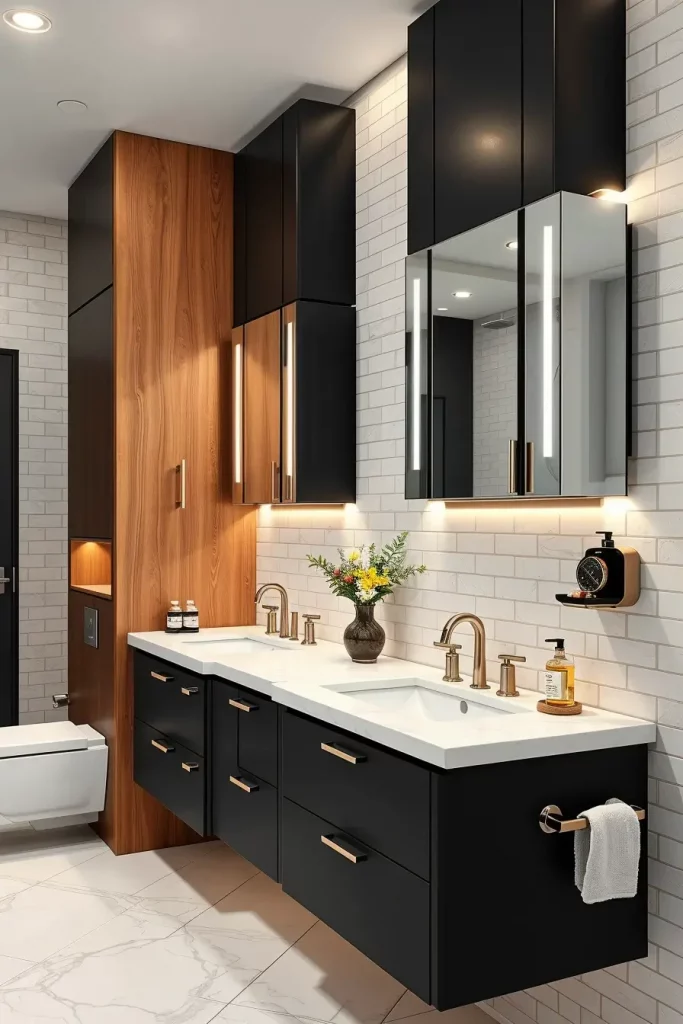 A double sink cabinetry generally consists of wide vanities with distinct storage areas, inbuilt drawer shelves, and huge mirrors that extend through the full width of the vanity. I usually tend to add tall side cabinets or built-in shelves to accommodate the other storage requirements. The consistency of the shared space is ensured by matching fixtures, harmonious finishes, and coordinated lighting.