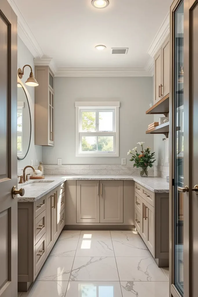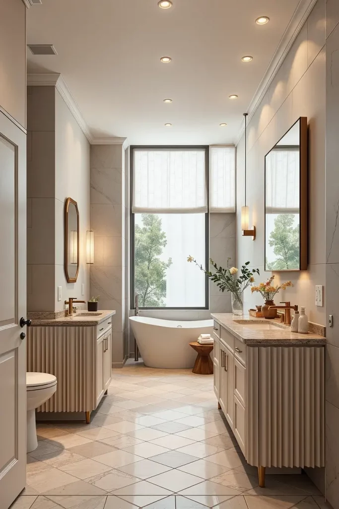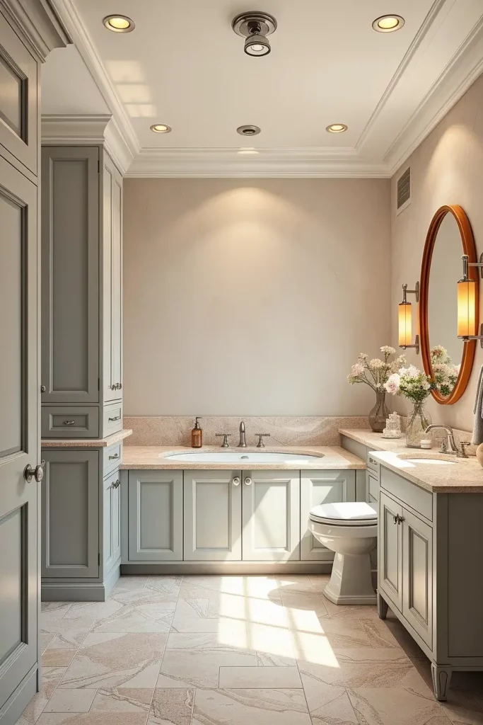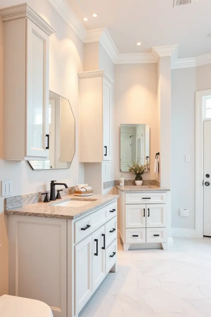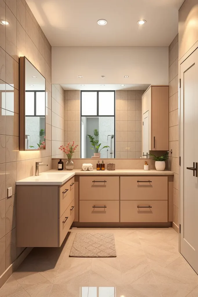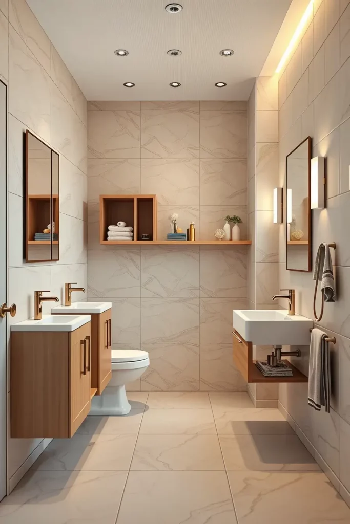 A double sink cabinetry generally consists of wide vanities with distinct storage areas, inbuilt drawer shelves, and huge mirrors that extend through the full width of the vanity. I usually tend to add tall side cabinets or built-in shelves to accommodate the other storage requirements. The consistency of the shared space is ensured by matching fixtures, harmonious finishes, and coordinated lighting.