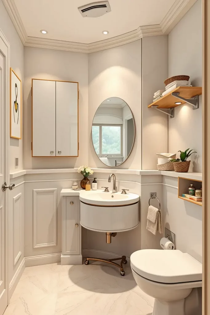 It has the characteristic triangular or curved corner cabinets, rotating shelves, compact vanities and overhead corner units capitalizing on vertical height. I offset such pieces with the other fixtures to make the corner cabinet part of the room design. The use of useful features like corner mirrors or mounted lighting assists in the enhancement of usability and visual symmetry.