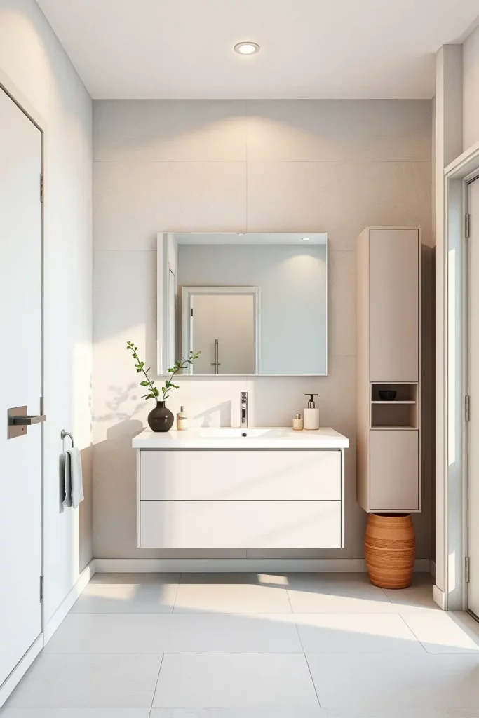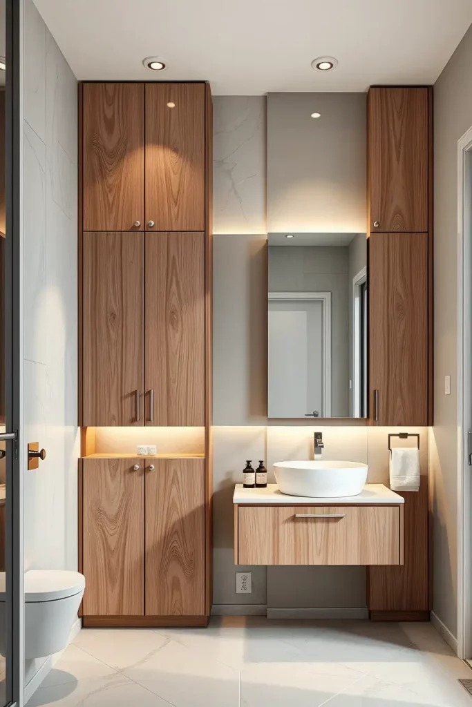 In choosing tall cabinets, I prefer to combine these cabinets with smooth hardware, smooth closing doors, and built-in lighting to make them useful. The interior can be arranged with adjustable shelving to be able to include everything such as towels or bulk toiletries, and the finishes of matte neutrals or wood veneers introduce a modern touch. The vanities can also be placed on the wall, which complements the overall design of these pieces.